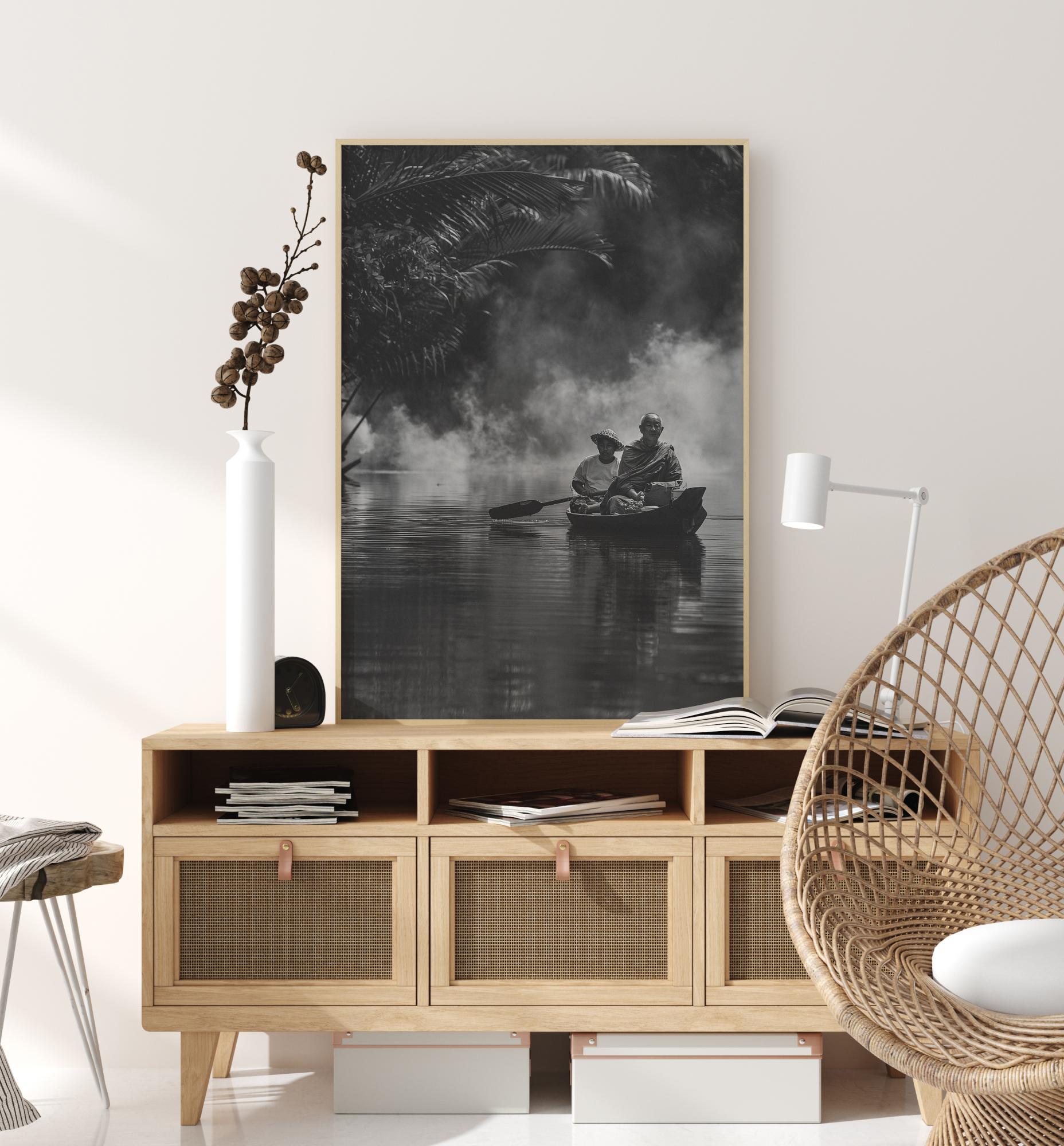 Una foto in bianco e nero pacifica in primo piano di due uomini che viaggiano lungo un fiume. Due uomini seduti pacificamente sulla loro barca da pesca gondola thailandese sembrano osservare l'ambiente circostante. La luce naturale del sole che filtra attraverso le nuvole riflette sulla barca sull'acqua. Si può quasi sentire il silenzio in questo poster. Perfetto per un ambiente tranquillo.