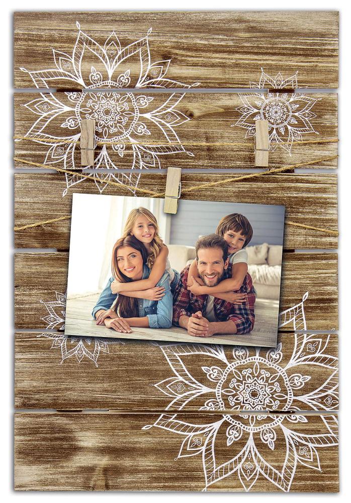 Questa è una bella cornice multipla in cui le immagini vengono fissate con mollette decorative in legno. Le immagini vengono attaccate su uno sfondo in legno con fiori dipinti di bianco in un design bohemien. La cornice ha spazio per due foto di dimensioni 10x15 cm. Le dimensioni esterne della cornice sono di 32x48,5 cm. questa cornice multipla può essere abbinato alle altre cornici da parete per creare un ambiente elegante nella tua casa. Supporto per appendere alla parete incluso.