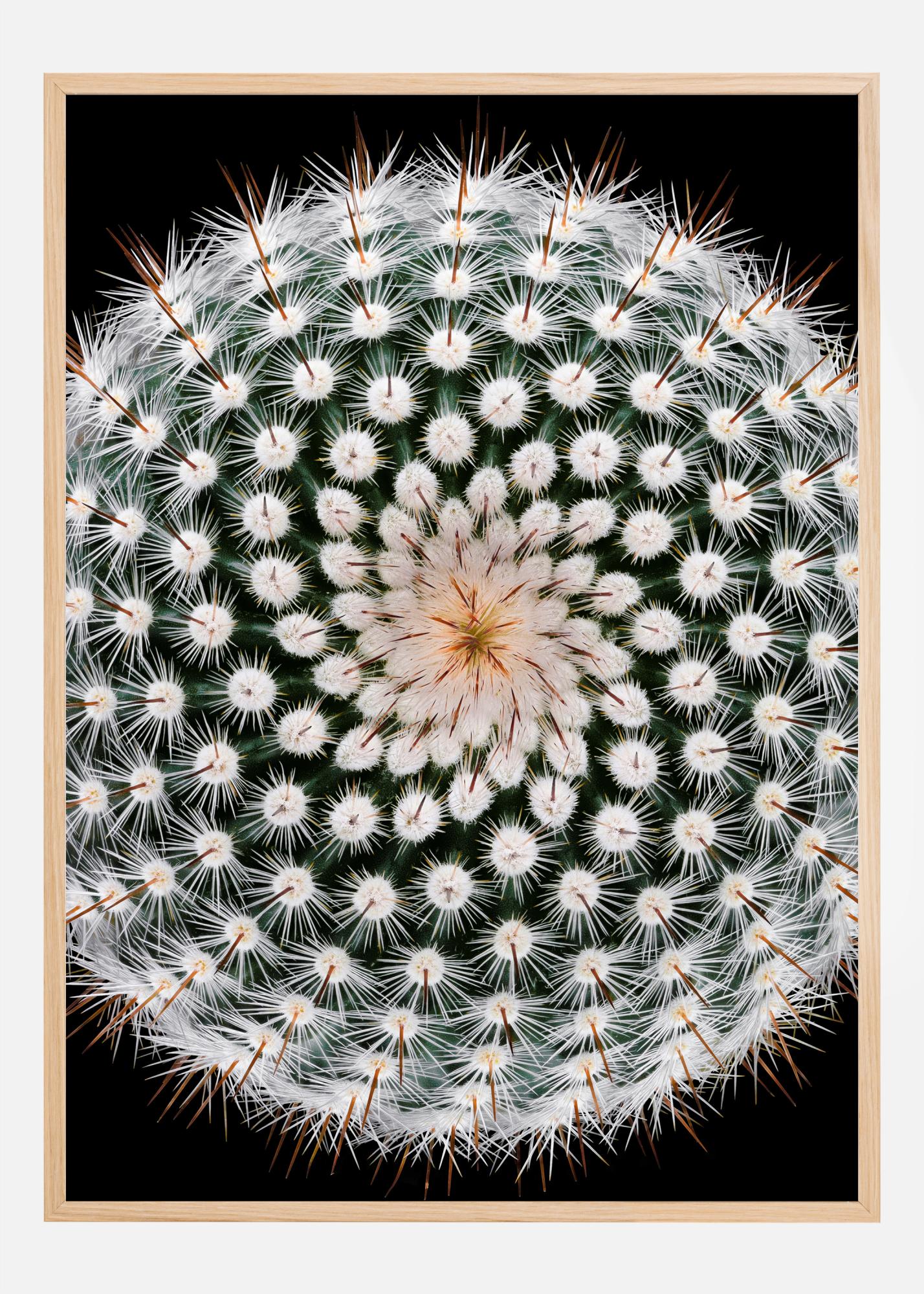 Una foto aerea di un cactus con fiori bianchi. Su uno sfondo nero, il colore verde scuro mette in risalto i fiori bianchi e le spine appuntite. La parte centrale della pianta ha un leggero tocco di giallo, che aggiunge colore alla stampa. Un poster perfetto per tutti gli amanti delle piante.