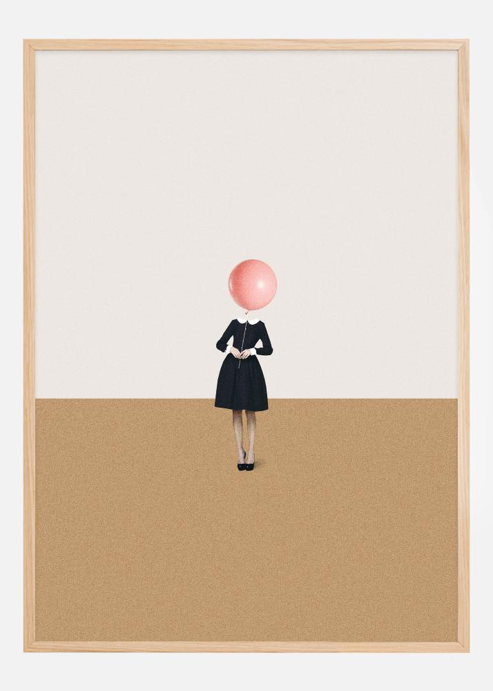 Questo poster artistico cattura l'attenzione con la sua immagine semplice ma potente di una donna vestita con un abito nero, in piedi da sola su uno sfondo di calde tonalità sabbia. Tiene quella che sembra essere una sfera perfettamente rotonda, una bolla rosa sopra la sua testa, creando un contrasto visivo e stimolante tra la persona e la superficie circostante.