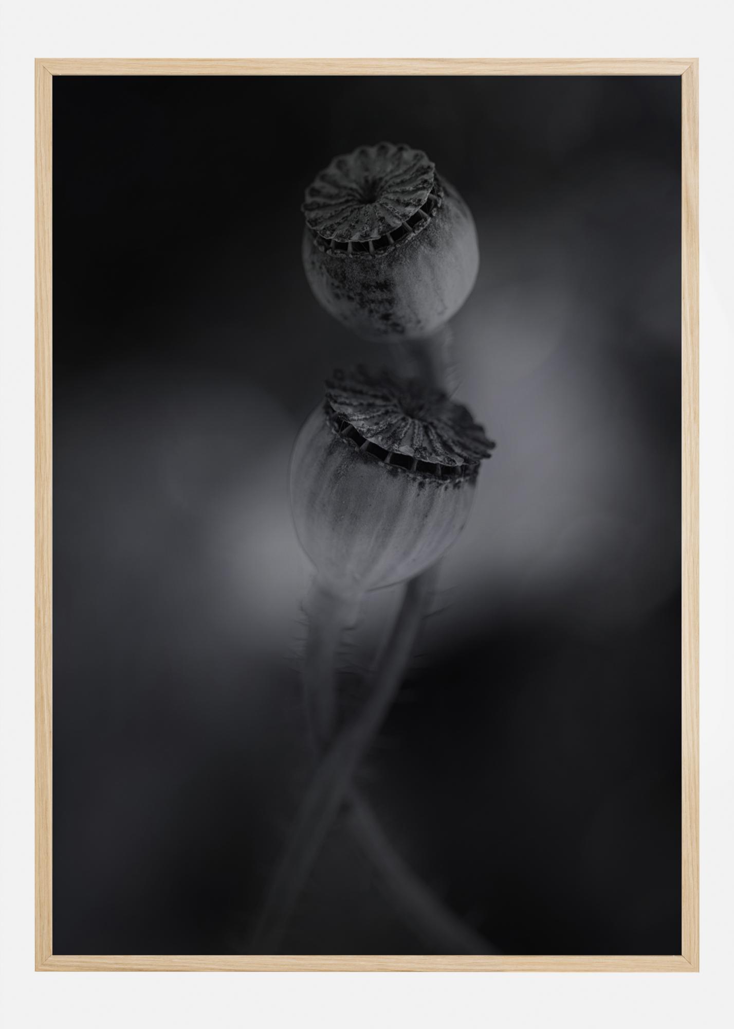 Un incredibile poster in bianco e nero con un primo piano di due papaveri sbocciati. I due baccelli dei semi si intrecciano mentre la luce naturale crea uno sfondo nero sfocato. Allo stesso tempo, la luce mette in risalto la bellezza delle piante. Aggiungi un tocco di tranquillità alla tua casa con questa stampa.