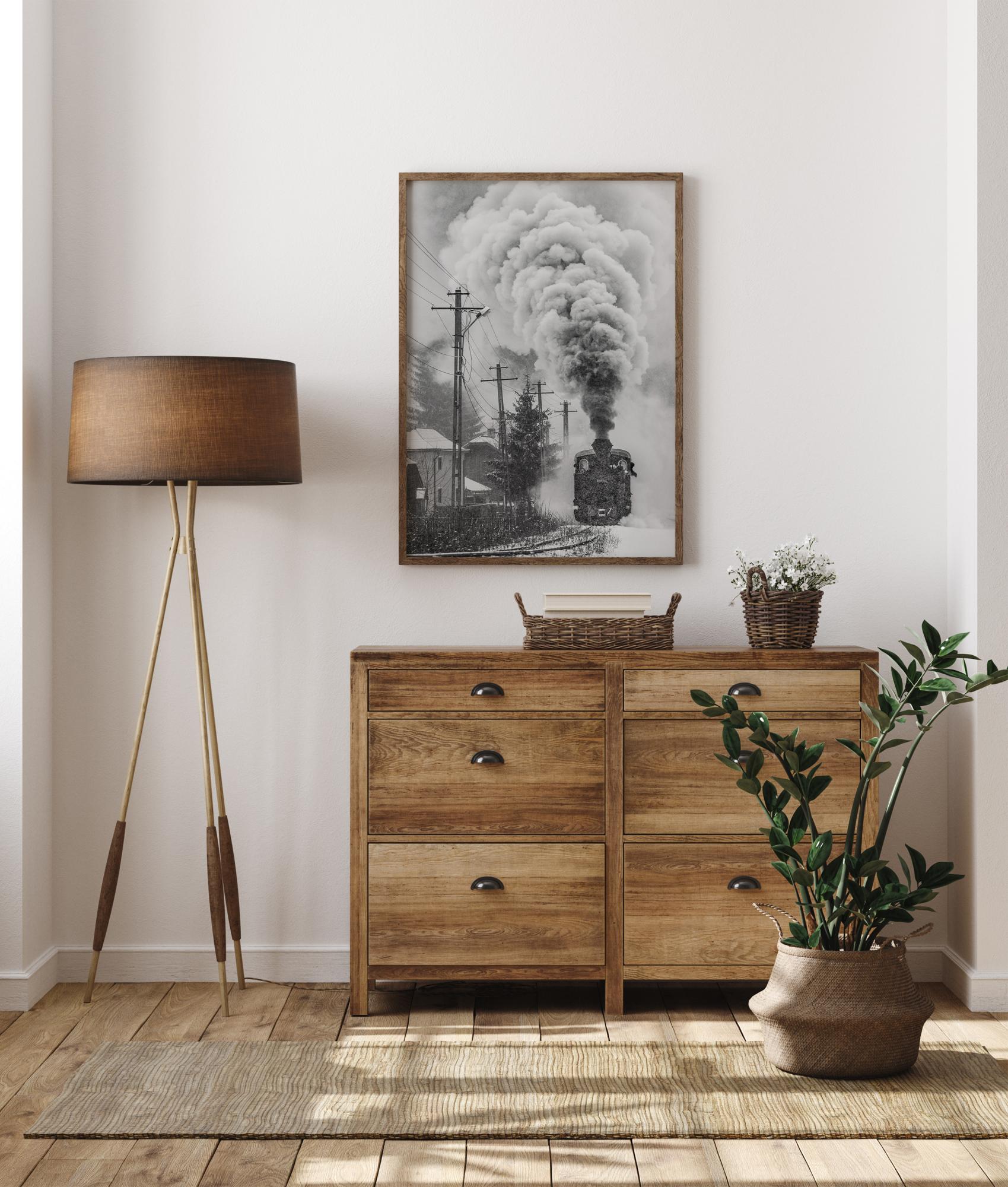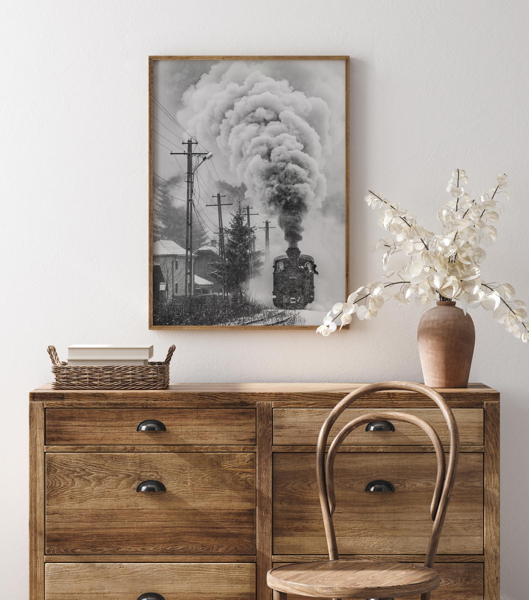Un poster drammatico con un treno a vapore nella neve. Lasciati coinvolgere nell'epicità di questa foto mentre il fumo si alza in alto. Ottieni quell'atmosfera natalizia quando appendi questo poster al muro.