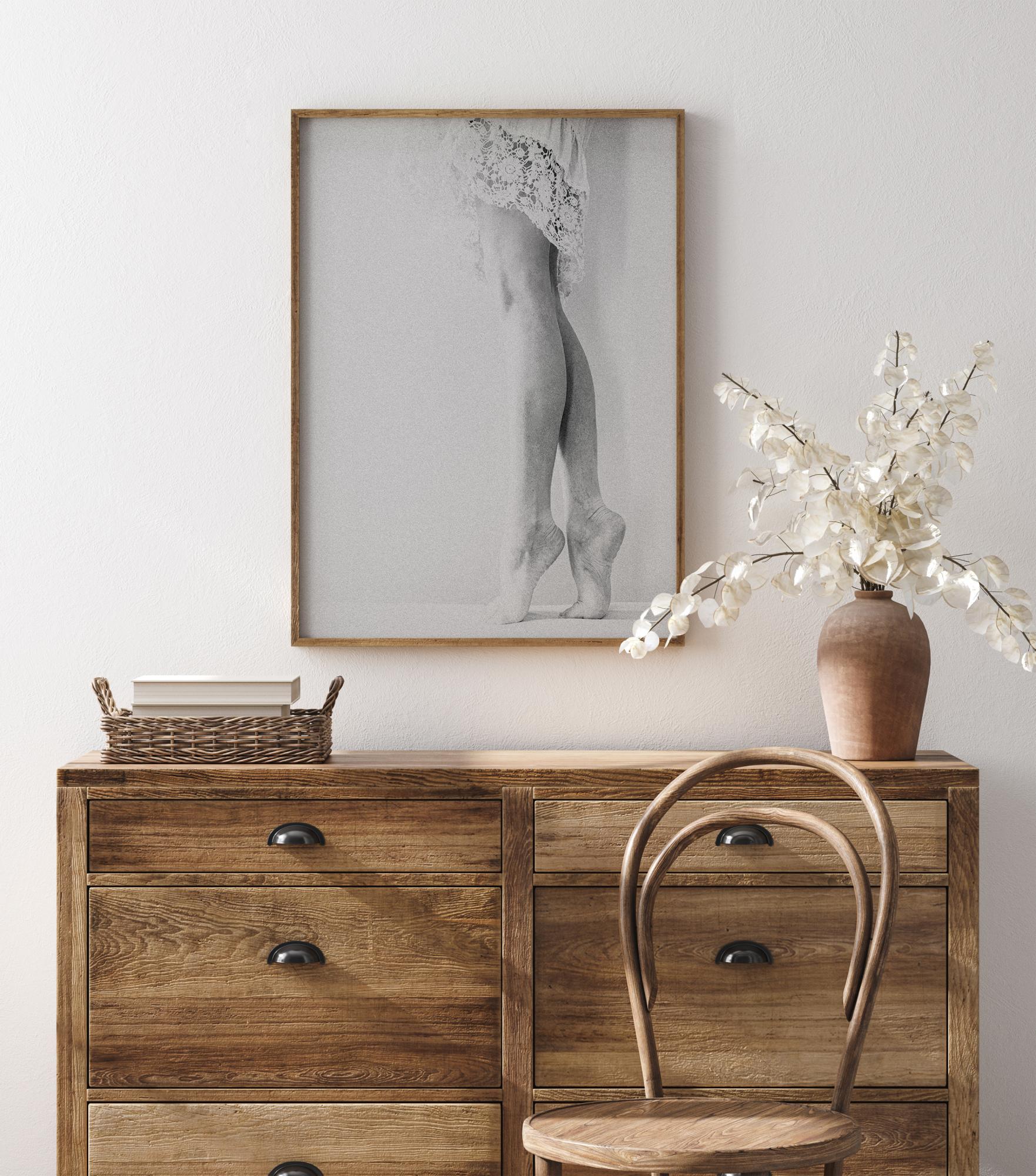 Un'elegante mezza figura di una donna in punta di verticale. La semplicità dell'immagine combinata con il sottile bianco rende questa immagine un'ottima aggiunta alla tua camera da letto o soggiorno.