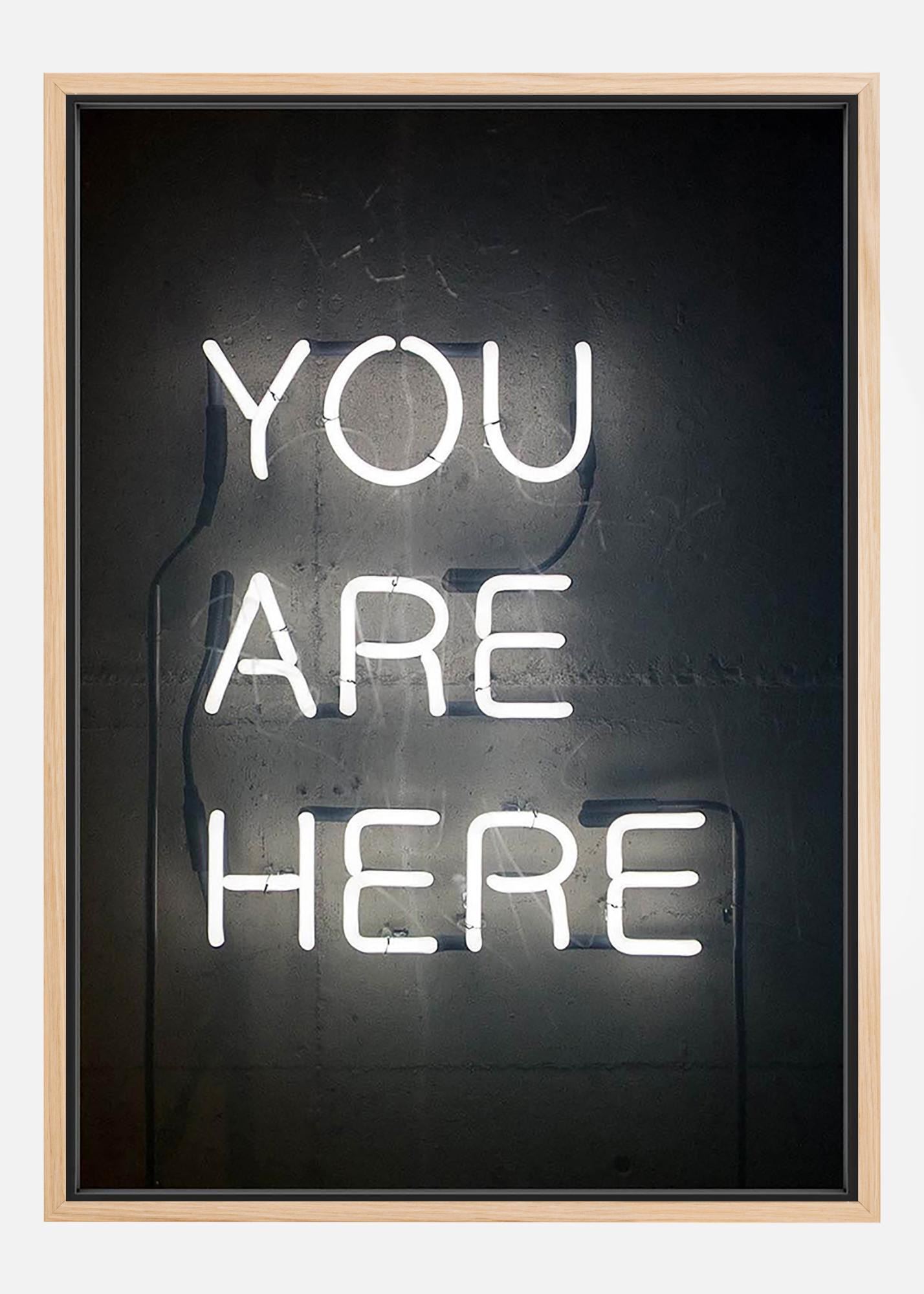 Un poster di testo in bianco e nero di un cartello al neon con il testo informativo "You are here". Un quadro semplice ed elegante con un tocco di umorismo piacevole, perfetto da combinare con altri dei nostri fantastici motivi in una grande parete di quadri.