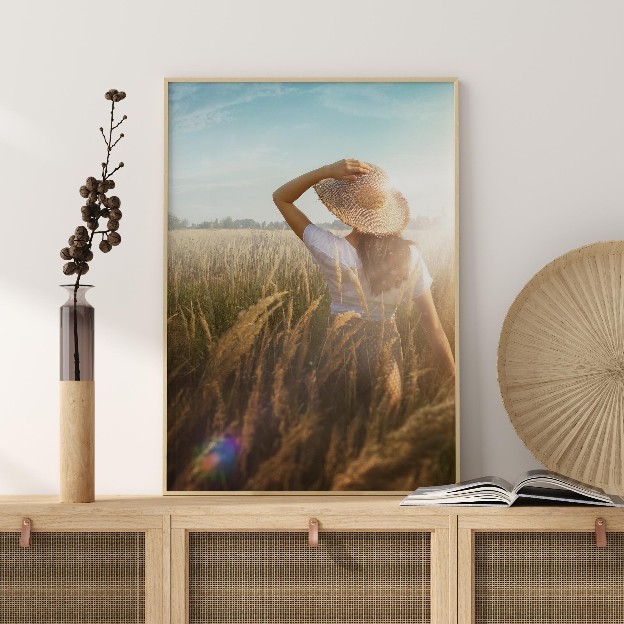 Una stampa rilassante e fresca di una donna con un cappello di paglia nei campi di grano. Il bellissimo cielo blu incontra il campo di grano dorato. Con la mano sulla testa, una giovane donna cammina attraverso i campi e gode dell'aria fresca. Un poster perfetto per tutti coloro che apprezzano la bellezza della natura.