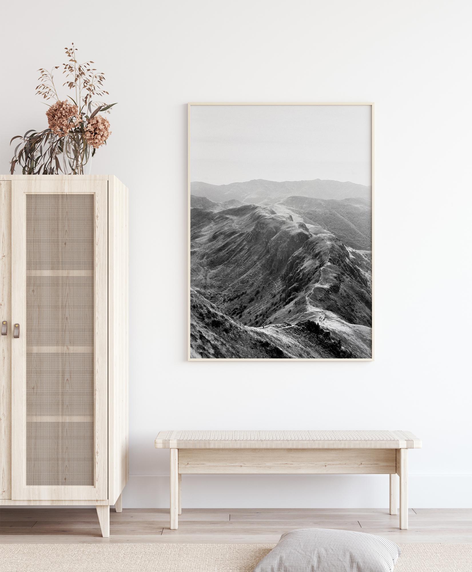 Un poster in bianco e nero con una catena montuosa. Le diverse tonalità di grigio si fondono perfettamente tra loro. Senza segni di vegetazione o vita, si può quasi sentire il silenzio sulle vette delle montagne. Appendi questa stampa su una parete colorata e ascolta il vento che soffia.