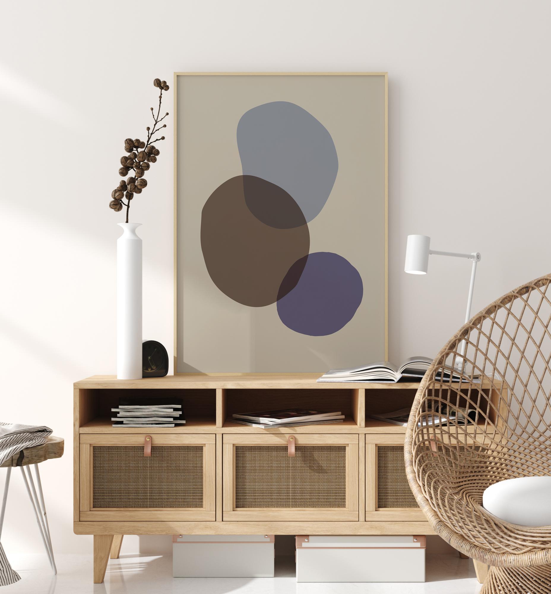 Un poster fantasioso con tre diverse forme colorate. Su uno sfondo bianco crema, le forme marroni, grigie e viola si sovrappongono l'una all'altra. La forma marrone domina le forme più piccole viola e grigie. Una semplice stampa da appendere nella tua casa. Usa la tua fantasia per immaginare cosa rappresentano le forme.