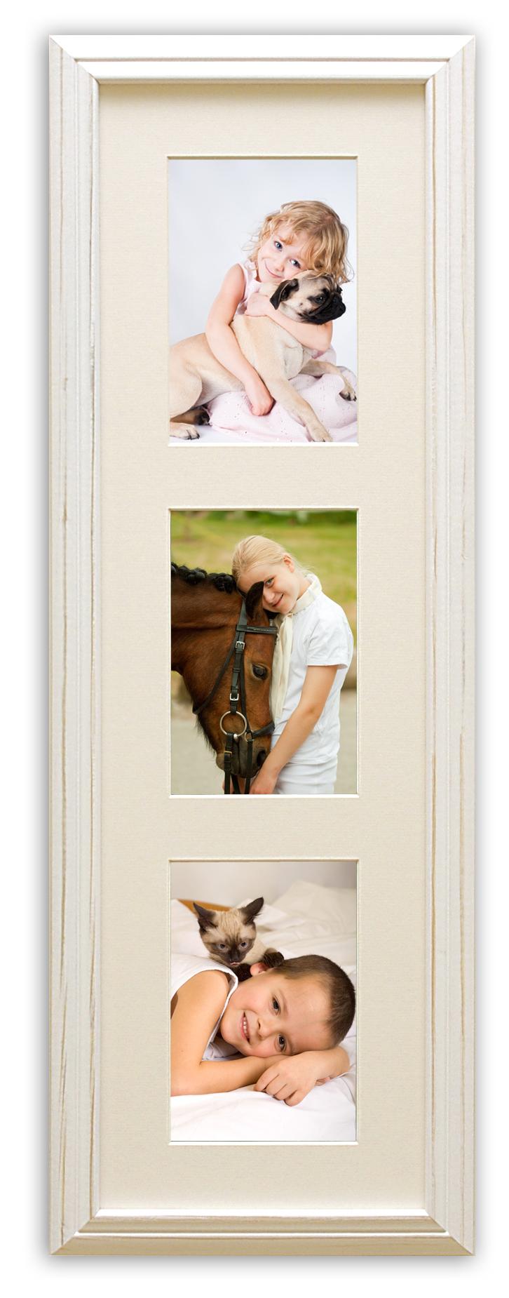 Collageram con spazio per 3 immagini, con una cornice in legno dallo stile vintage con una tonalità di base bianca e parti consumate in cui si può vedere la superficie in legno della cornice. Questo conferisce alla cornice il suo carattere speciale.