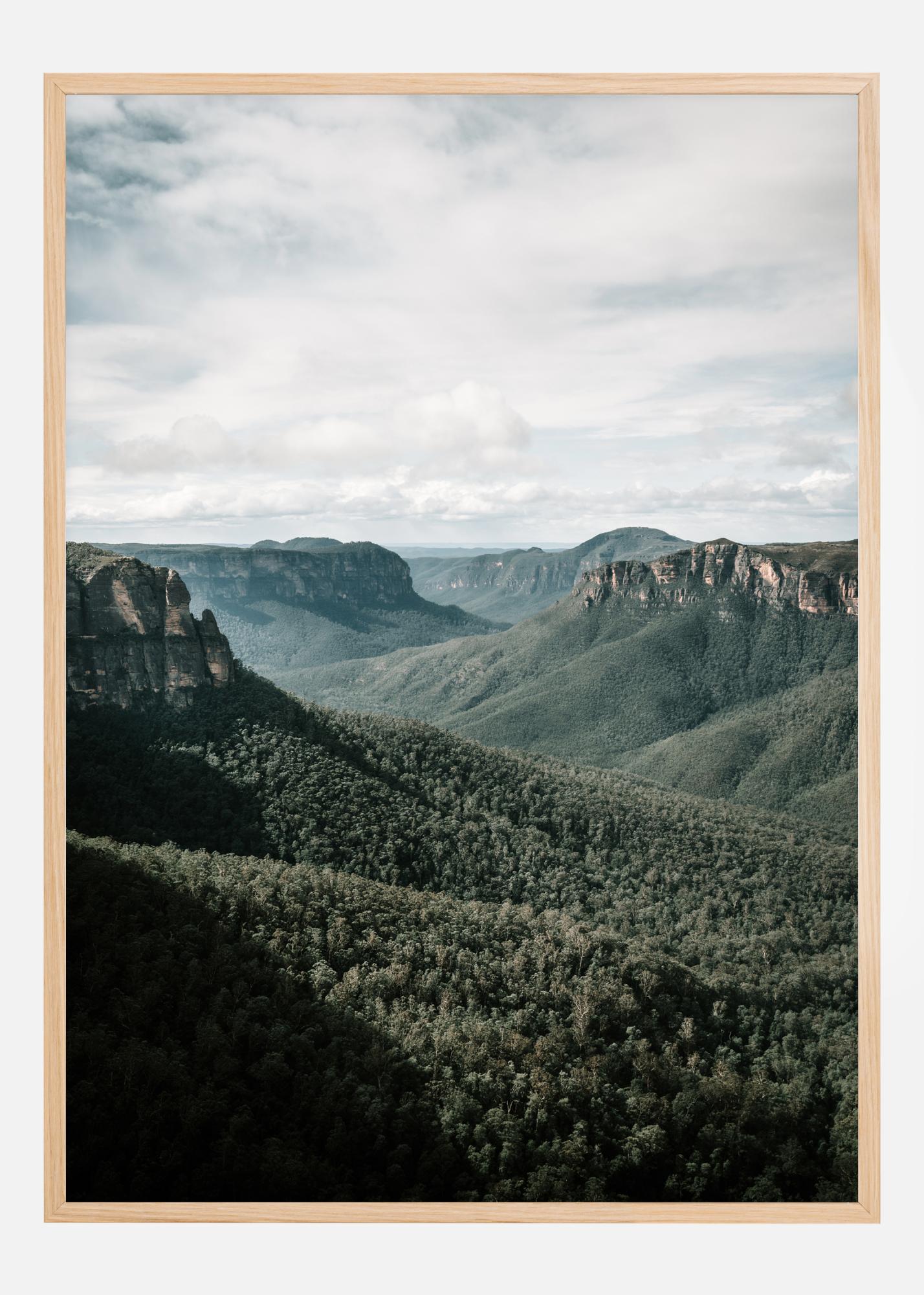 Una pressione mozzafiato di un paesaggio collinare. La fitta vegetazione copre il paesaggio dalla valle alle cime rocciose. Il cielo nuvoloso mette in risalto i morbidi colori verdi delle colline e crea un'atmosfera tranquilla. Per gli amanti della natura, questo è il poster perfetto da appendere in casa.