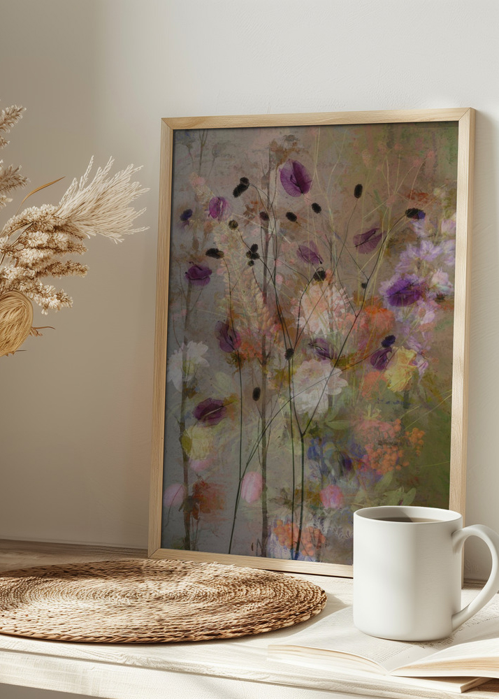 Una fantastica stampa dipinta a mano di fiori viola e bianchi essiccati. Su uno sfondo color beige, i colori naturali dei fiori creano un'atmosfera rilassante. Le tonalità morbide di verde, viola e arancione sono molto delicate per gli occhi. Un bellissimo poster che si adatta perfettamente accanto al tuo tavolo da trucco.