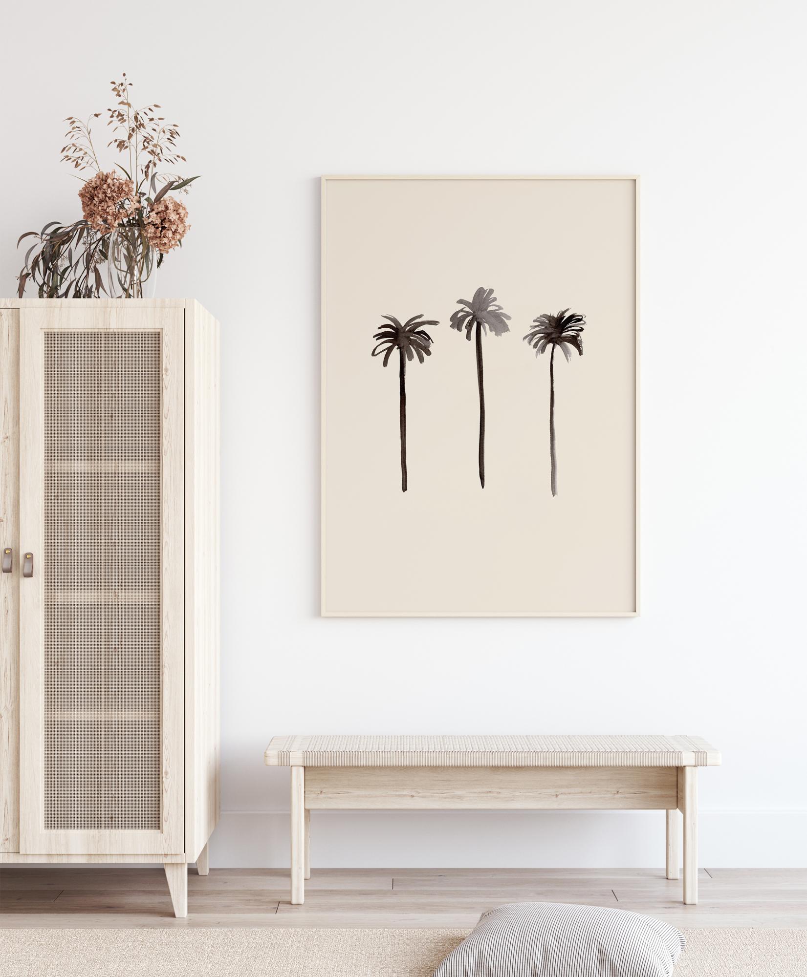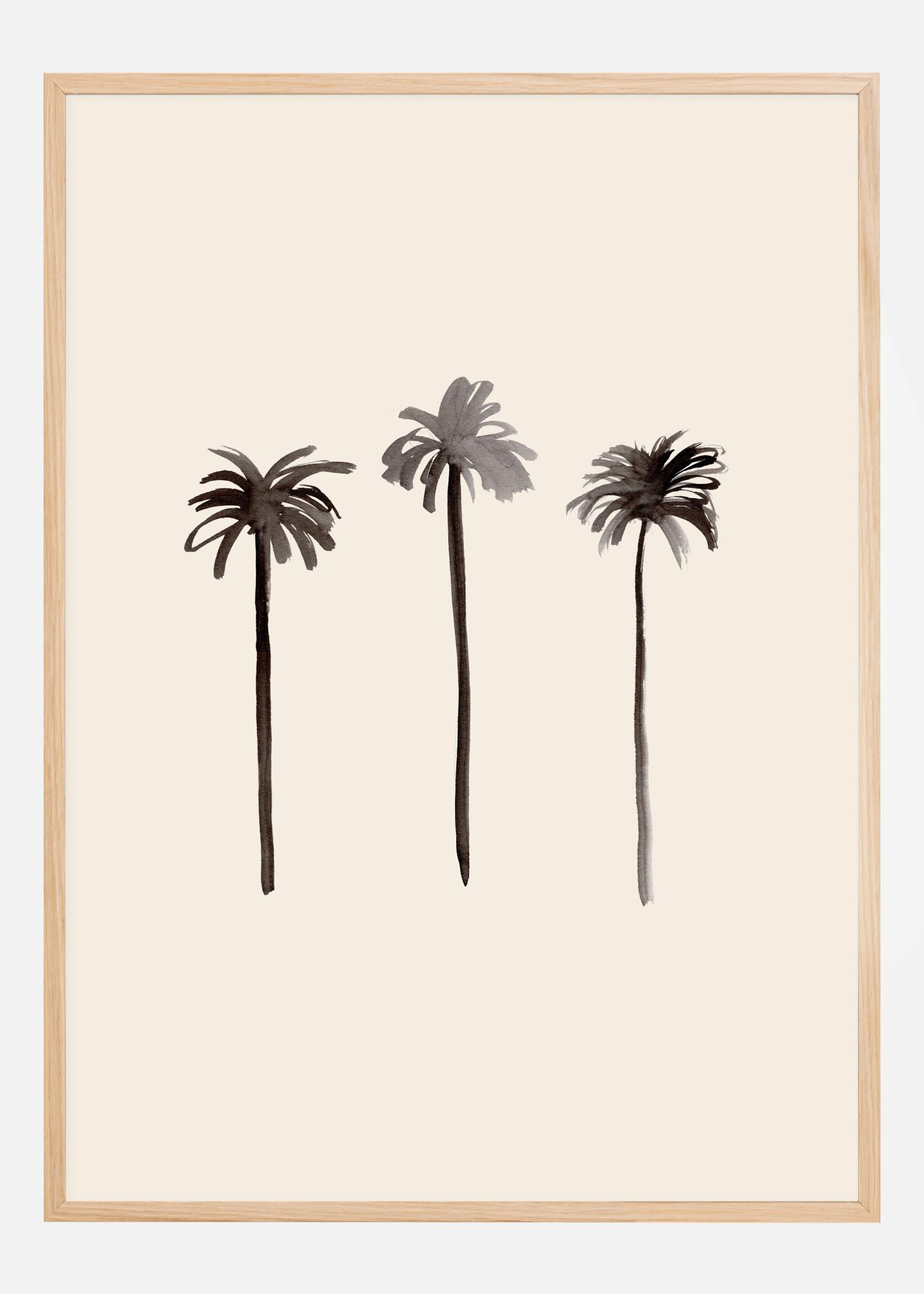 Una semplice stampa in bianco e nero con tre palme in fila. Su uno sfondo beige sono state utilizzate diverse tonalità di nero per creare l'ombra sulle foglie. Un semplice poster adatto da appendere sulla parete del soggiorno.