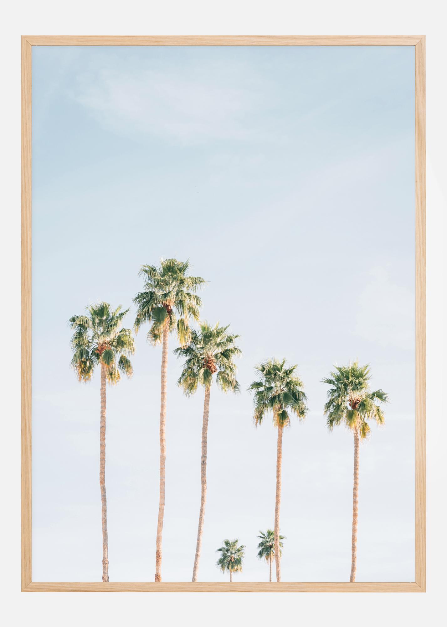 Una deliziosa stampa di cinque palme in fila. Il cielo azzurro si fonde perfettamente con le tonalità morbide di verde e marrone delle palme. Altre due palme possono essere viste in lontananza. Un bellissimo poster adatto per essere appeso su una parete azzurra.