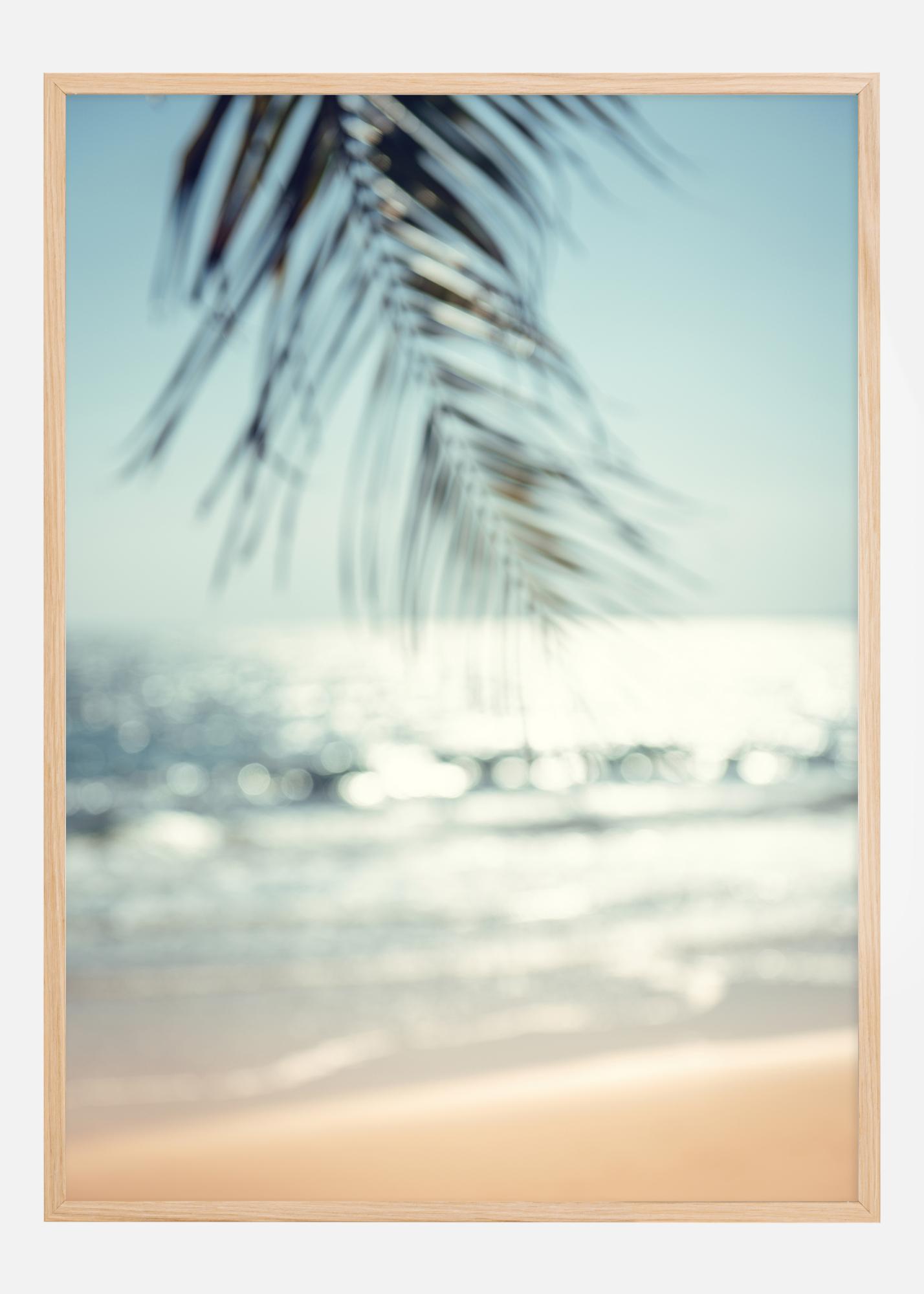 Questo poster è una fuga onirica verso latitudini tropicali e paesaggi rilassanti. Il soggetto si concentra su un ramo di palma sfocato che avvolge l'immagine, con un mare scintillante e una spiaggia dorata come sfondo. La palette di colori emana calore e relax con le sue morbide sfumature di blu, turchese e sabbia, che insieme creano una sensazione di giornate soleggiate al mare.