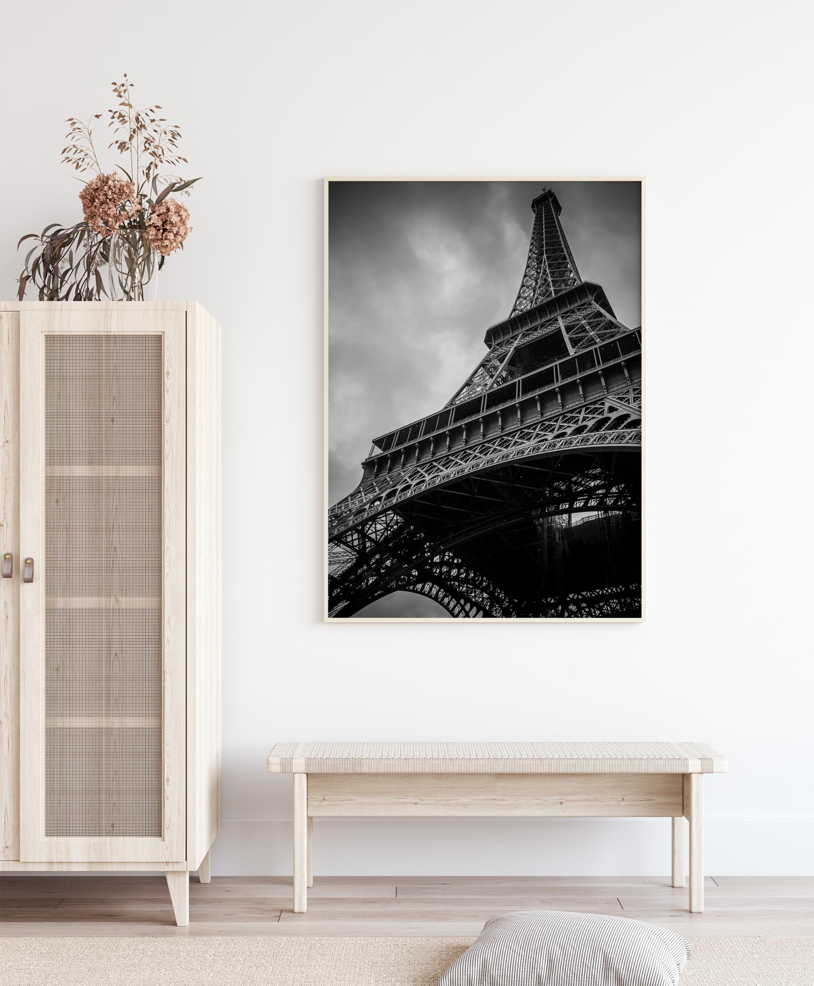 Un poster prospettico dal basso della vertiginosa Torre Eiffel. Con il cielo grigio nuvoloso, questa bellissima struttura di ferro mostra la sua forma simile a una piramide mentre si erge in alto. Per tutti coloro che amano Parigi, questa è una stampa perfetta da regalare.