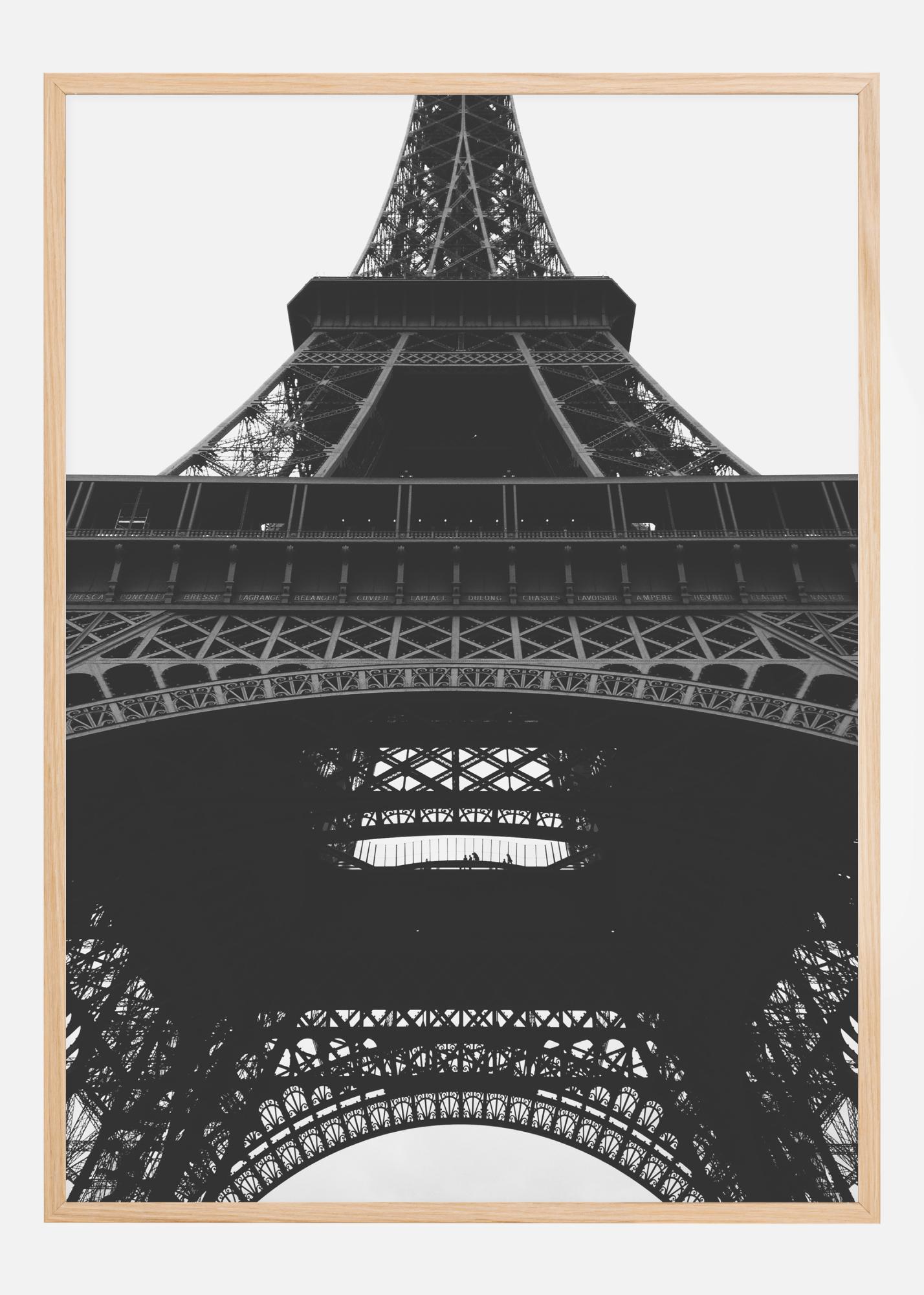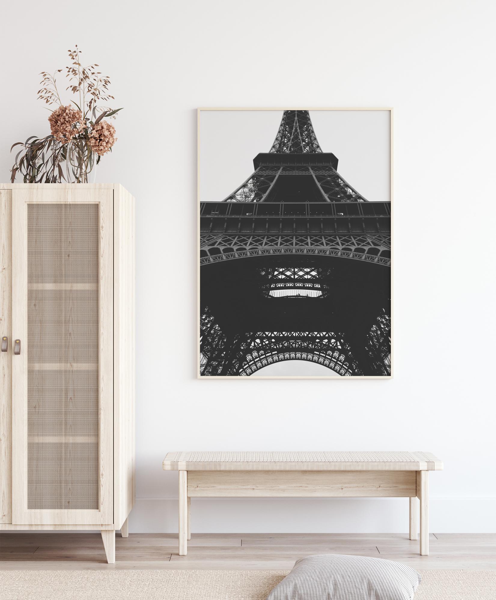 Un fantastico poster in bianco e nero con la Torre Eiffel. L'immagine della massiccia struttura di ferro è scattata da una prospettiva rana, facendo fondere perfettamente la torre con il cielo grigio. Questo capolavoro tecnico crea una struttura leggera, ariosa e robusta. Una stampa perfetta da appendere in un ambiente moderno.
