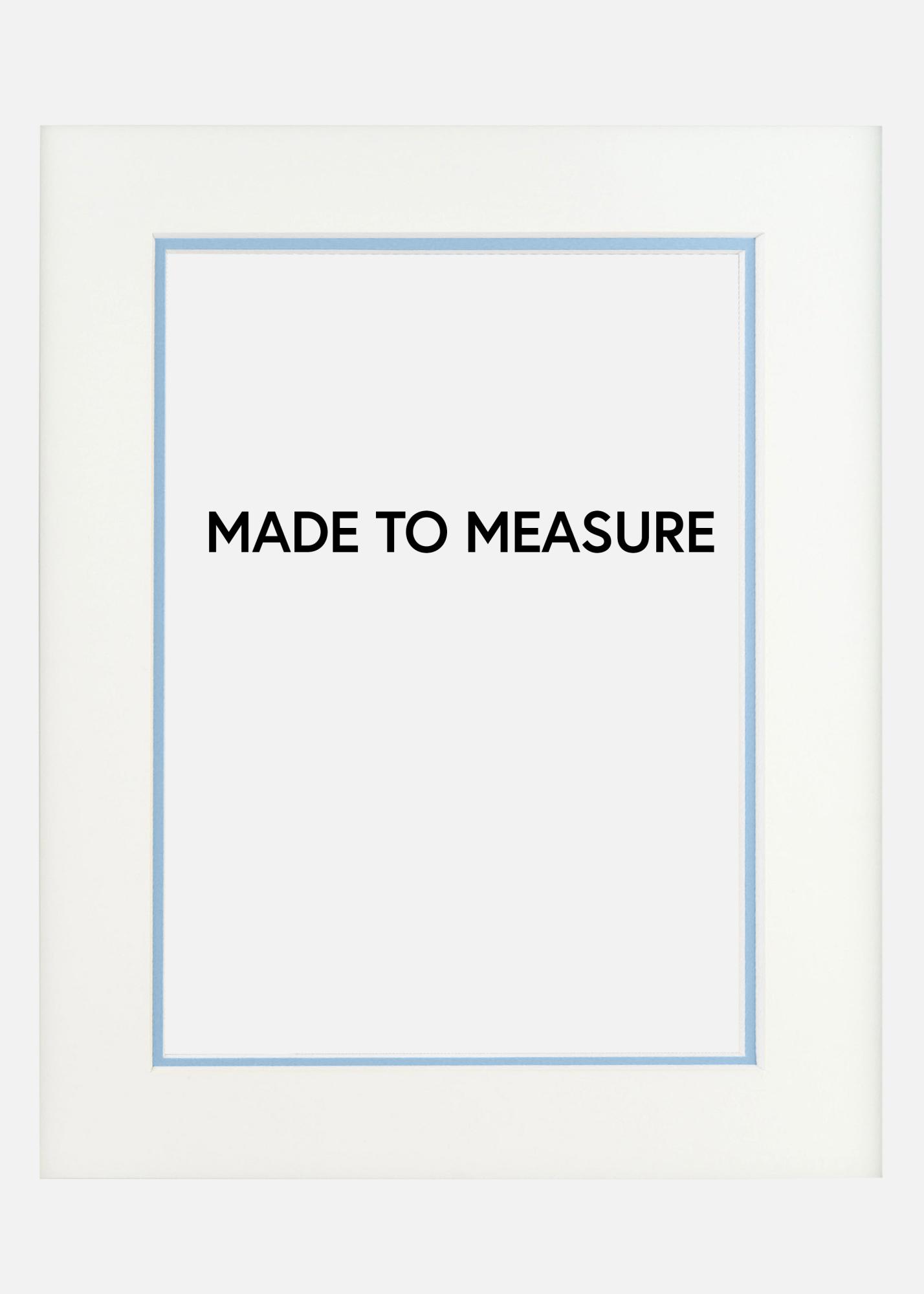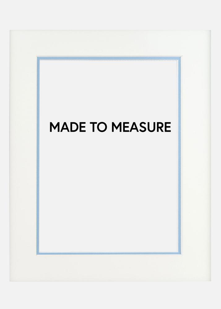 passe-partout su misura a due strati con un passe-partout bianco come base e uno strato inferiore di colore azzurro chiaro che crea un bordo colorato di 5 mm intorno all'immagine. Perfetto quando si desidera creare un incorniciatura d'impatto che mette in risalto la propria immagine e conferisce una maggiore profondità al soggetto. Tutti i nostri passe-partout hanno bordi tagliati con precisione ad un angolo di 45 gradi, garantendo un'incorniciatura seria e professionale per le tue immagini.
