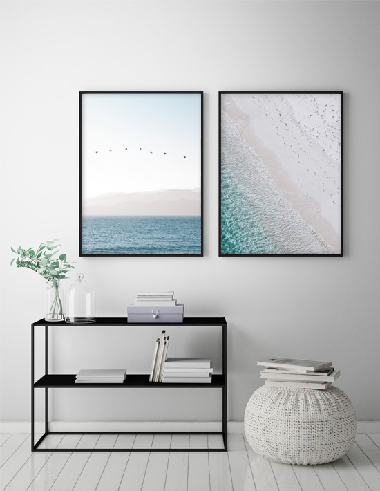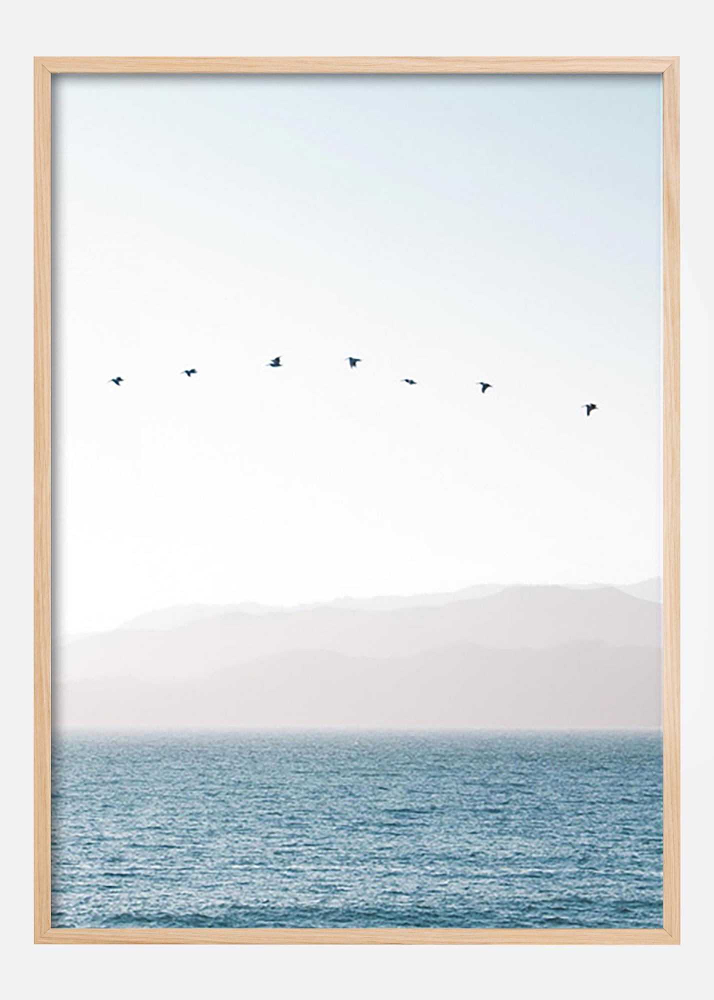 Una bellissima fotografia naturalistica di uccelli che volano sopra l'acqua blu verso uno sfondo di montagne coperte di nebbia e un cielo bianco. Un poster tranquillo e armonioso dalle tonalità rinfrescanti che si adatta bene sia in bagno che in camera da letto o soggiorno.