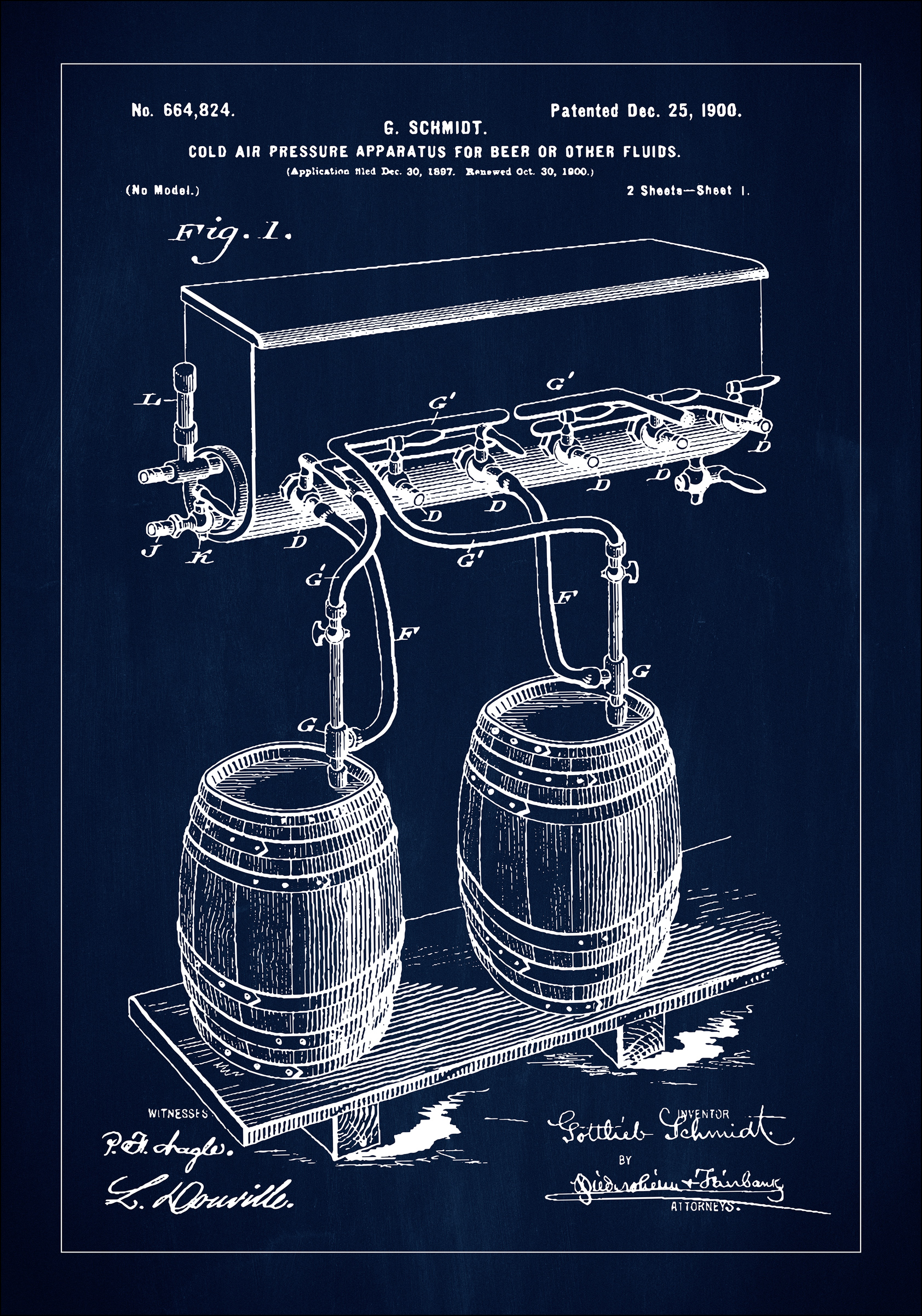 Questa sofisticata locandina brevettuale mostra un design innovativo del 25 dicembre 1900, brevetto numero 664.824, sviluppato da G. Schmidt. Il soggetto ritrae un apparecchio di raffreddamento per birra o altri liquidi, un'invenzione che ha rivoluzionato la gestione e la somministrazione delle bevande. Il disegno del brevetto, dettagliato con precisione, evidenzia le componenti del sistema come contenitori, tubazioni e meccanismi di ventilazione, rendendolo un'opera d'arte di brillantezza tecnica. L'illustrazione in bianco e nero sullo sfondo blu profondo offre un contrasto esteticamente piacevole che cattura l'occhio e ispira la mente.