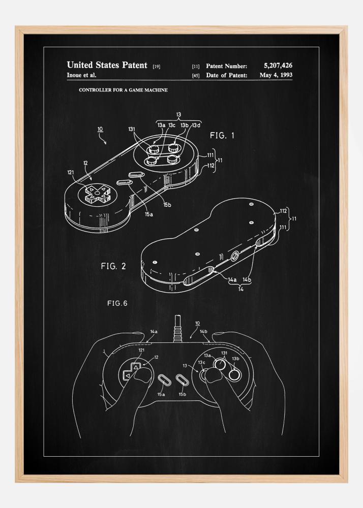 Questo poster di brevetto mette in risalto un design classico di un controller di gioco per Nintendo, numero di brevetto 5,207,426, datato 4 maggio 1993, su uno sfondo elegante a lavagna nera. Il disegno del brevetto mostra diverse viste del controller, comprese la parte superiore, inferiore e la prospettiva dell'utente, descrivendo in dettaglio la disposizione dei pulsanti e delle leve, che sono diventati centrali nell'interazione dei giocatori con i mondi di gioco digitali.