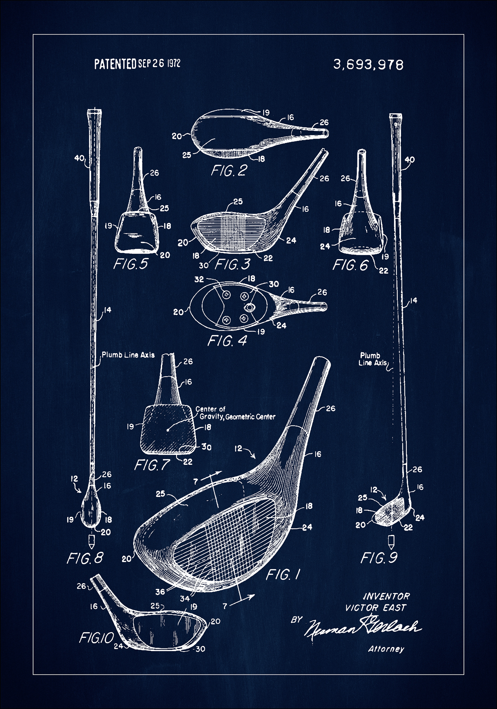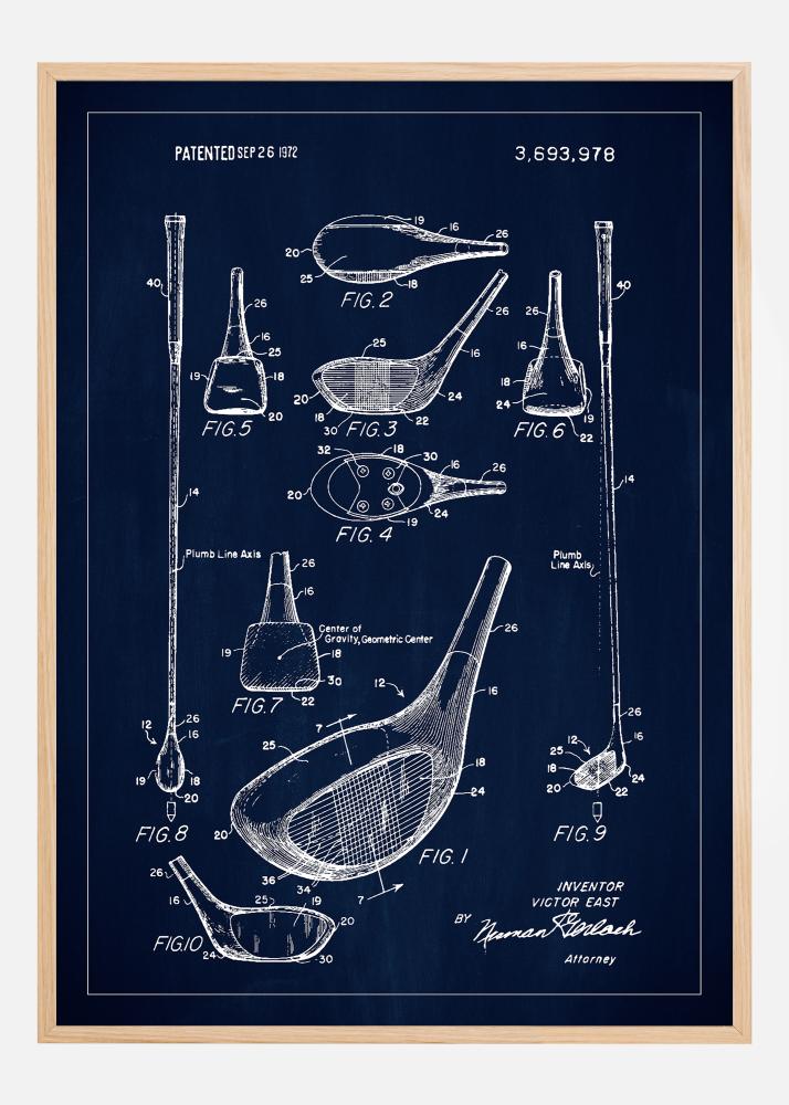 Questo elegante poster di brevetto presenta un'illustrazione dettagliata di un brevetto per una mazza da golf, concesso il 26 settembre 1972, sotto il numero di brevetto 3,693,978. Ogni aspetto del design è esposto attraverso una serie di figure ben concepite, da sezioni trasversali complete a panoramiche dettagliate della testa della mazza. Questo disegno di brevetto abilmente eseguito è un omaggio ai progressi tecnici dello sport e mette in luce l'ingegnosità e la precisione dell'inventore.