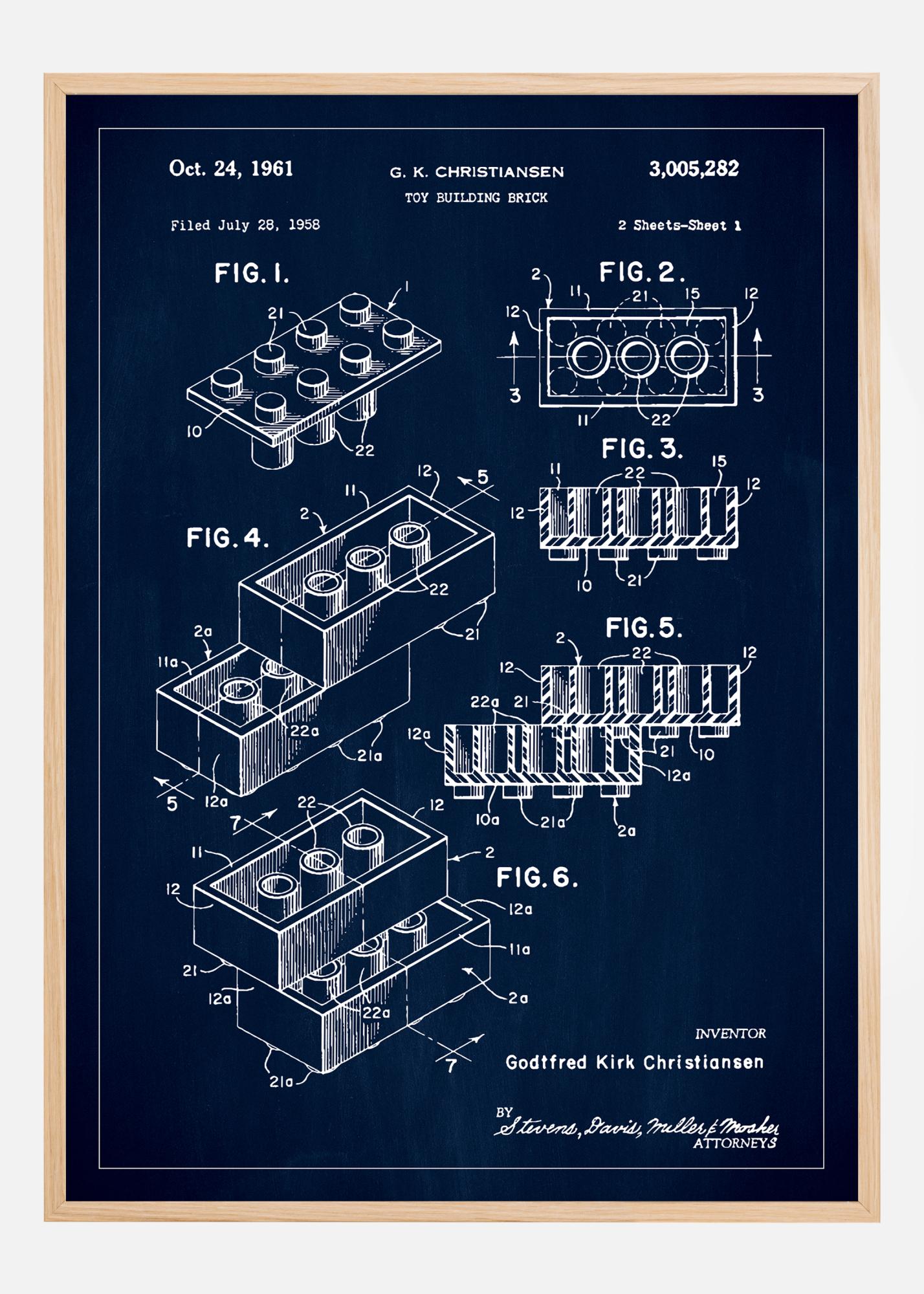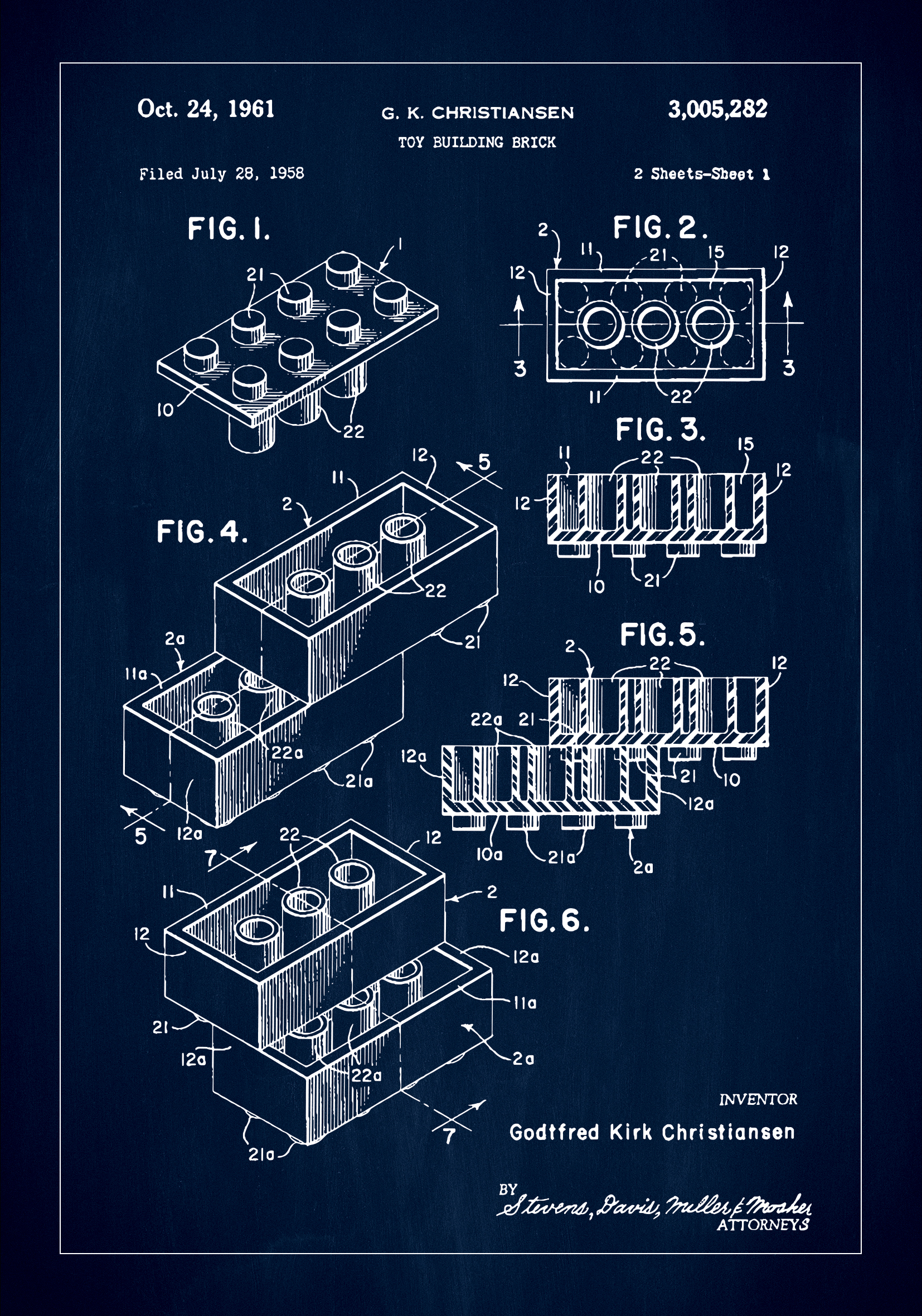 Questa dettagliata poster di brevetto rappresenta il design geniale del mattoncino da costruzione giocattolo di Lego che ha trasformato il gioco creativo e l'apprendimento, creato da Godtfred Kirk Christiansen. Con il numero di brevetto 3.005.282, concesso il 24 ottobre 1961, questa illustrazione cattura l'essenza di un'invenzione che ha ispirato e deliziato generazioni di costruttori e pensatori.