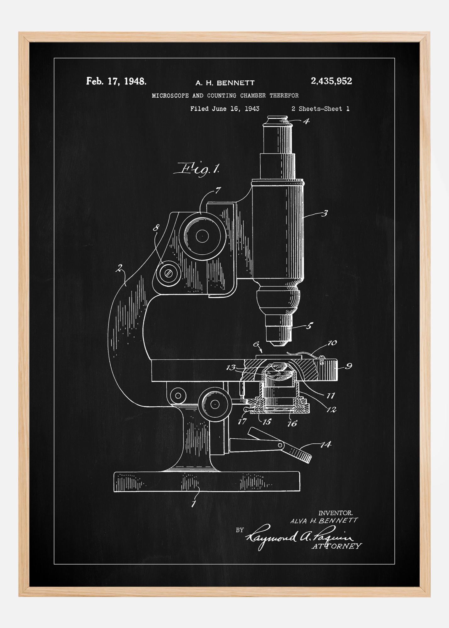 Questo poster di brevetto presenta uno sfondo sofisticato di lavagna nera che mette elegantemente in risalto un disegno di brevetto classico di un microscopio del 17 febbraio 1948. Le linee bianche contro lo sfondo scuro creano un effetto drammatico e illustrano la costruzione del microscopio e le caratteristiche innovative della sua camera di conteggio. Questa è un'iconica rappresentazione della precisione scientifica e della bellezza nel design funzionale.