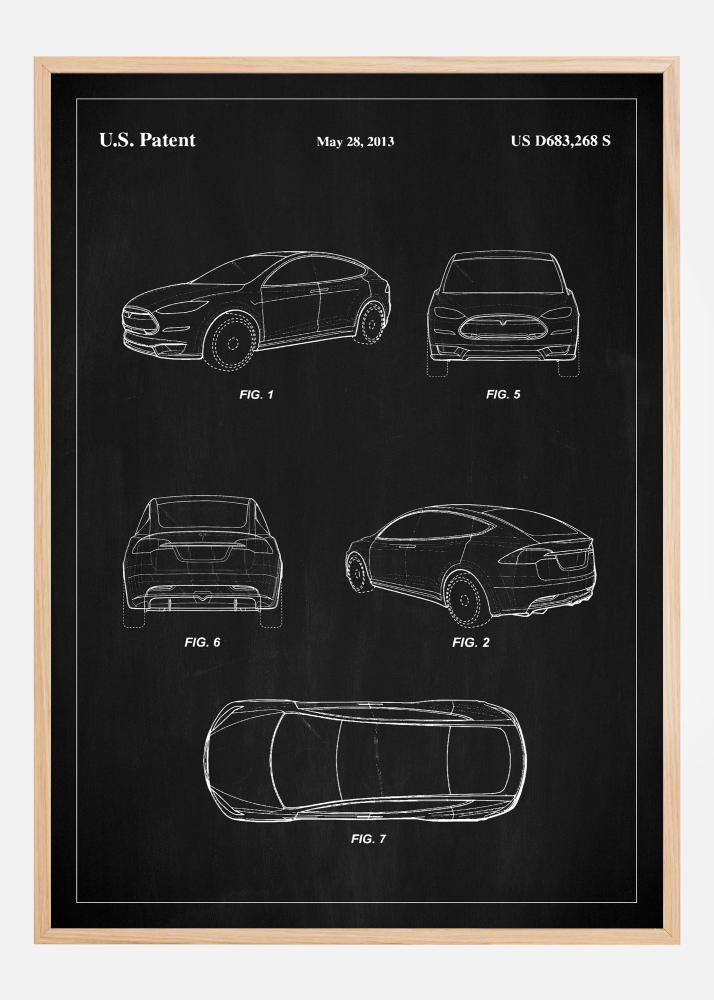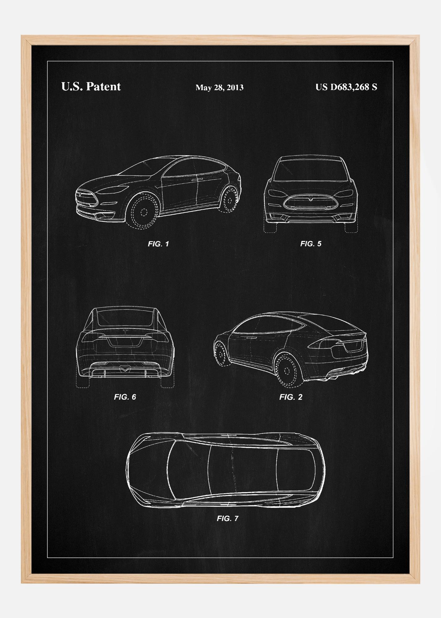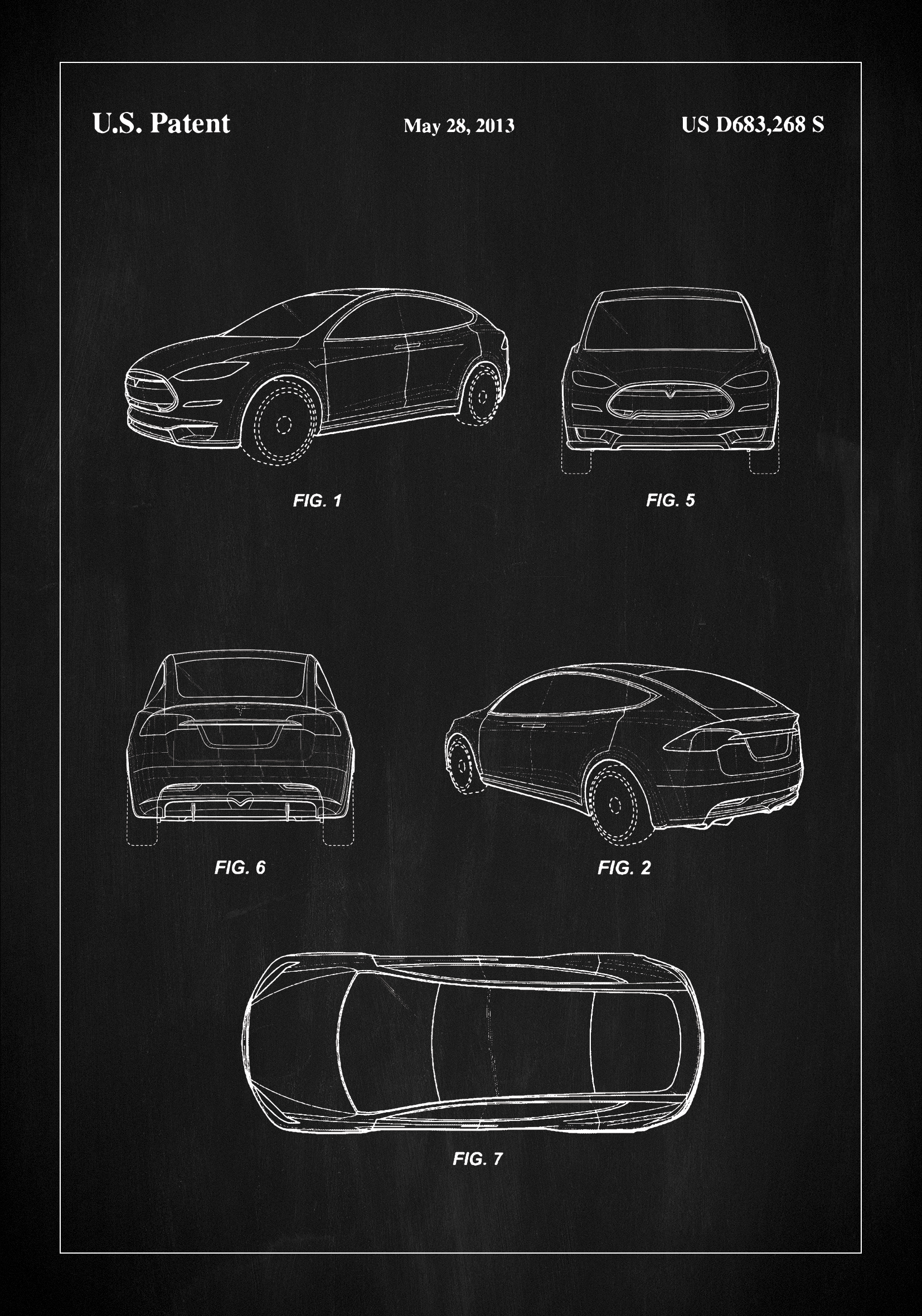 Questo elegante e sofisticato poster di brevetto è un omaggio al design automobilistico moderno di una Tesla, documentato attraverso il brevetto statunitense con numero US D683,268 S il 28 maggio 2013. Il poster mostra una scultura di veicolo distintiva che definisce l'avanguardia della produzione automobilistica. Ogni linea e curva è accuratamente delineata in bianco sul nero della lavagna, creando un contrasto magnifico che cattura e mantiene l'interesse dell'osservatore.