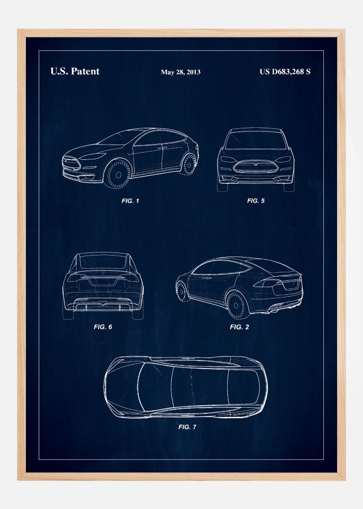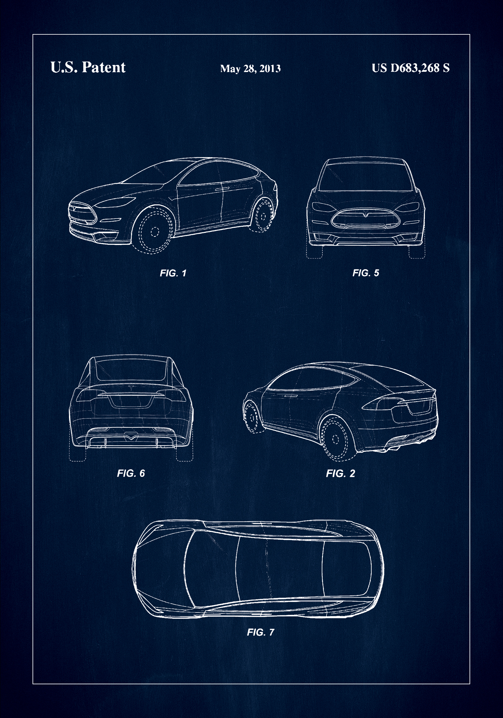 Siamo orgogliosi di presentare questo poster di brevetto, una rappresentazione grafica di US D683,268 S, concesso il 28 maggio 2013, che raffigura un design di veicolo di una Tesla che è tanto innovativo quanto esteticamente accattivante. Il poster è un'aggiunta ideale a qualsiasi casa o luogo di lavoro di collezionisti, offrendo una visione unica del processo di design dietro una delle forme più importanti nell'industria automobilistica.