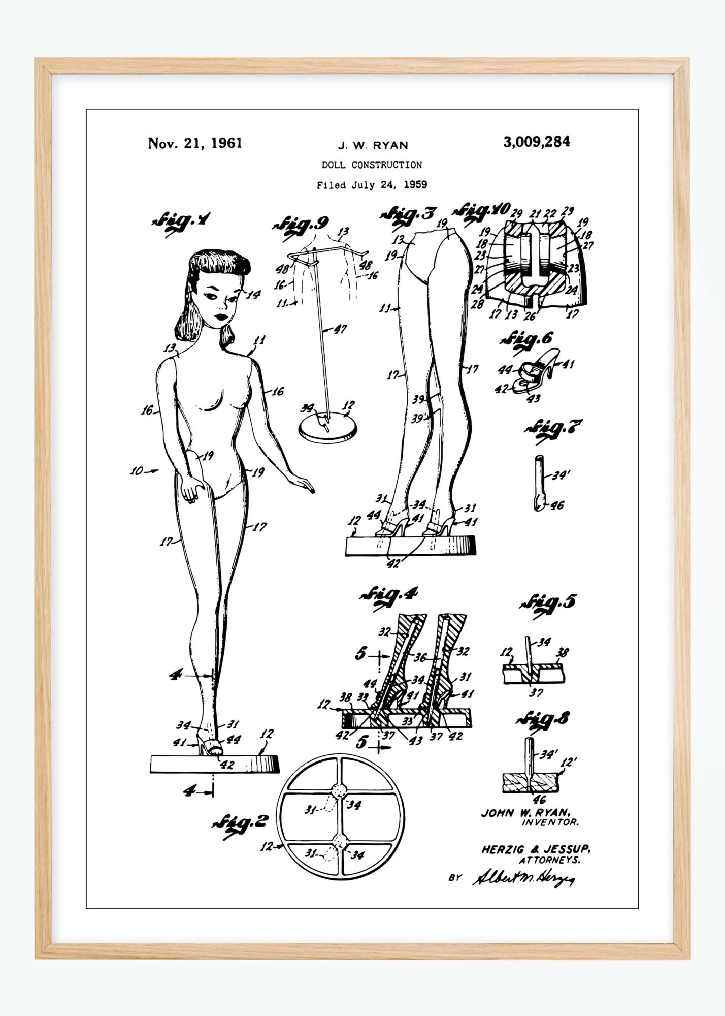 Questa distintiva stampa di brevetto rivela la costruzione di una bambola Barbie, brevettata il 21 novembre 1961 sotto il numero 3,009,284. Inventata da J.W. Ryan e domanda depositata il 24 luglio 1959, il disegno mostra le parti uniche della bambola e le interconnessioni, un affascinante esempio di design di giocattoli e innovazione della metà del XX secolo. Il poster è un pezzo di conversazione di alta classe, perfetto per collezionisti o come dettaglio decorativo giocoso in uno spazio creativo.