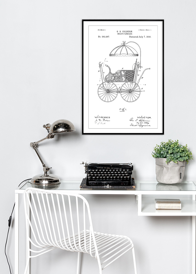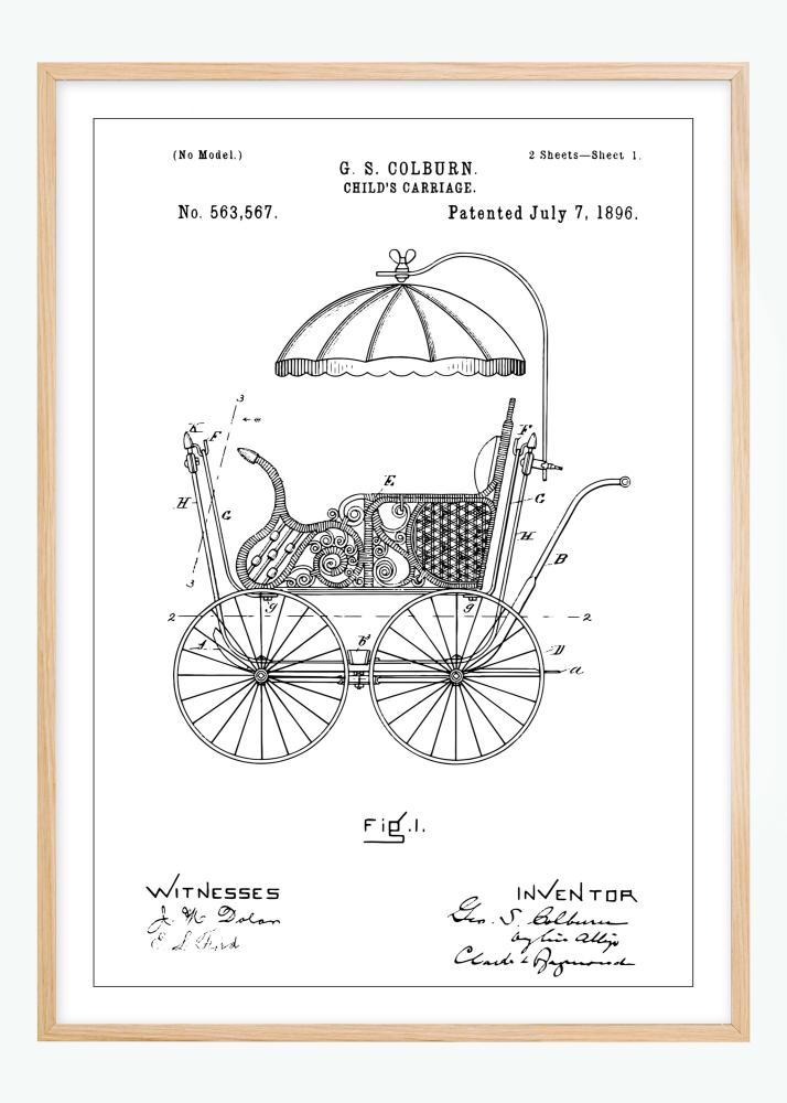 Questa affascinante poster di brevetto raffigura una carrozzina dalla fine del 1800, numero di brevetto 563.567, concesso il 7 luglio 1896 a G.S. Colburn. La ricchezza di dettagli nel disegno cattura l'artisticità e l'ingegnosità del tempo, rendendo questo poster un delizioso articolo decorativo per chiunque apprezzi il lavoro manuale e il design storico. L'illustrazione mostra una nostalgica carrozzina, completa di ruote appuntite e un elegante tettuccio, che riflette l'eleganza e lo stile di un'epoca passata.