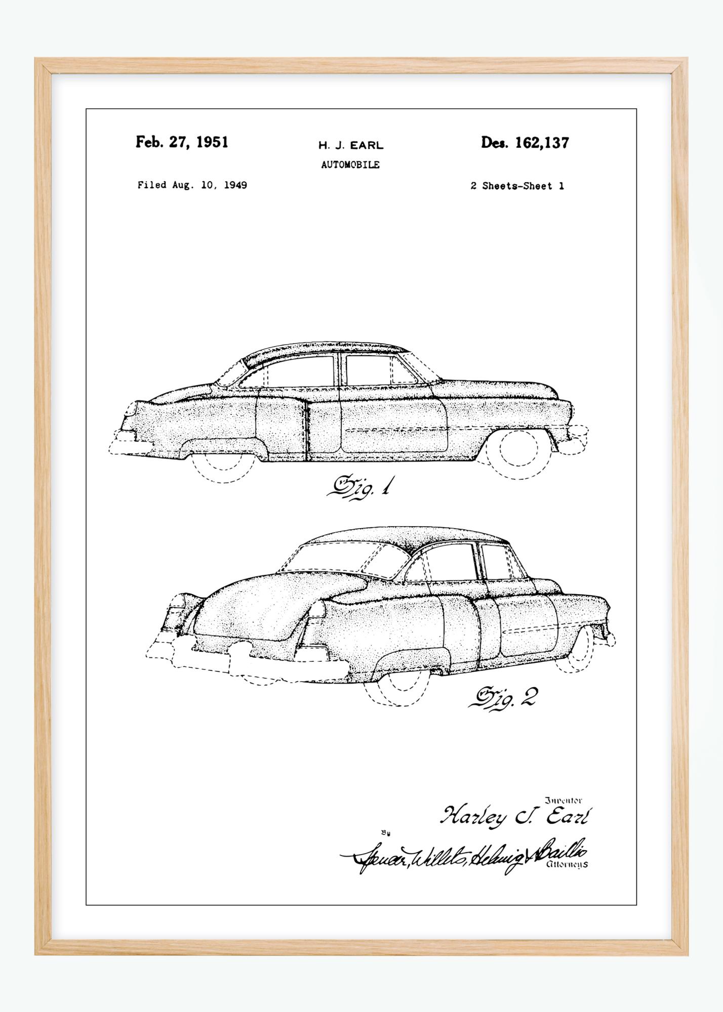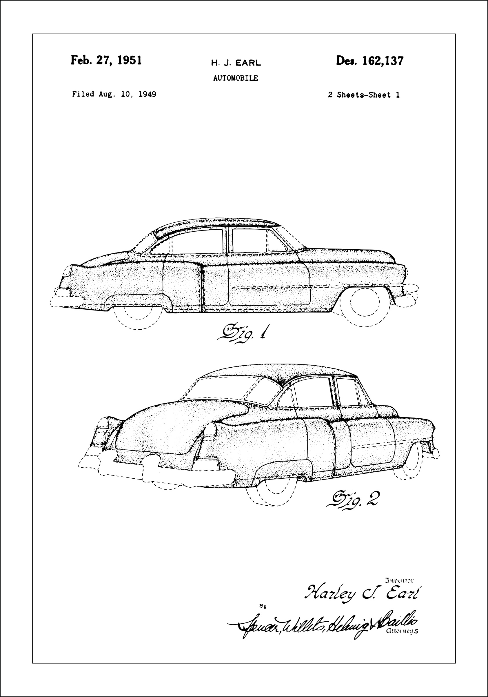 Questa locandina di brevetto presenta un disegno sofisticato di un'auto Cadillac, progettata dal famoso H.J. Earl. Datata 27 febbraio 1951, con numero di brevetto Des. 162,137, presentata originariamente il 10 agosto 1949, questa immagine cattura l'essenza dell'industria automobilistica del dopoguerra. Il soggetto è un omaggio all'epoca d'oro dell'automobile americana ed è realizzato con un'attenzione ai dettagli che attrae sia i produttori di auto che gli amanti del design.