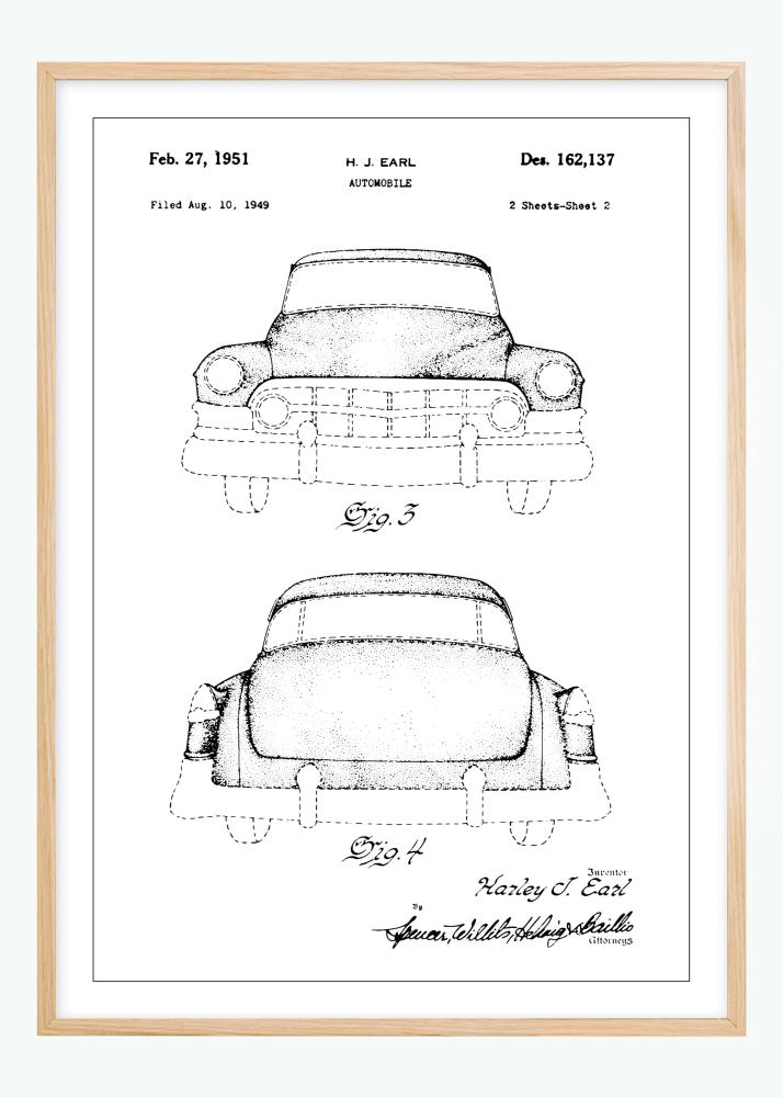 Questo elegante poster di brevetto raffigura un'iconica Cadillac, un omaggio ai progressi ingegneristici automobilistici del XX secolo. Progettato da H.J. Earl e brevettato il 27 febbraio 1951 con il numero Des. 162,137, questo disegno di brevetto è un must per tutti coloro che apprezzano l'estetica e la storia del design della classica automobile. Il poster mostra il veicolo in profilo dalla parte anteriore e posteriore, e la ricchezza di dettagli delle illustrazioni evoca un senso di nostalgia e ammirazione.