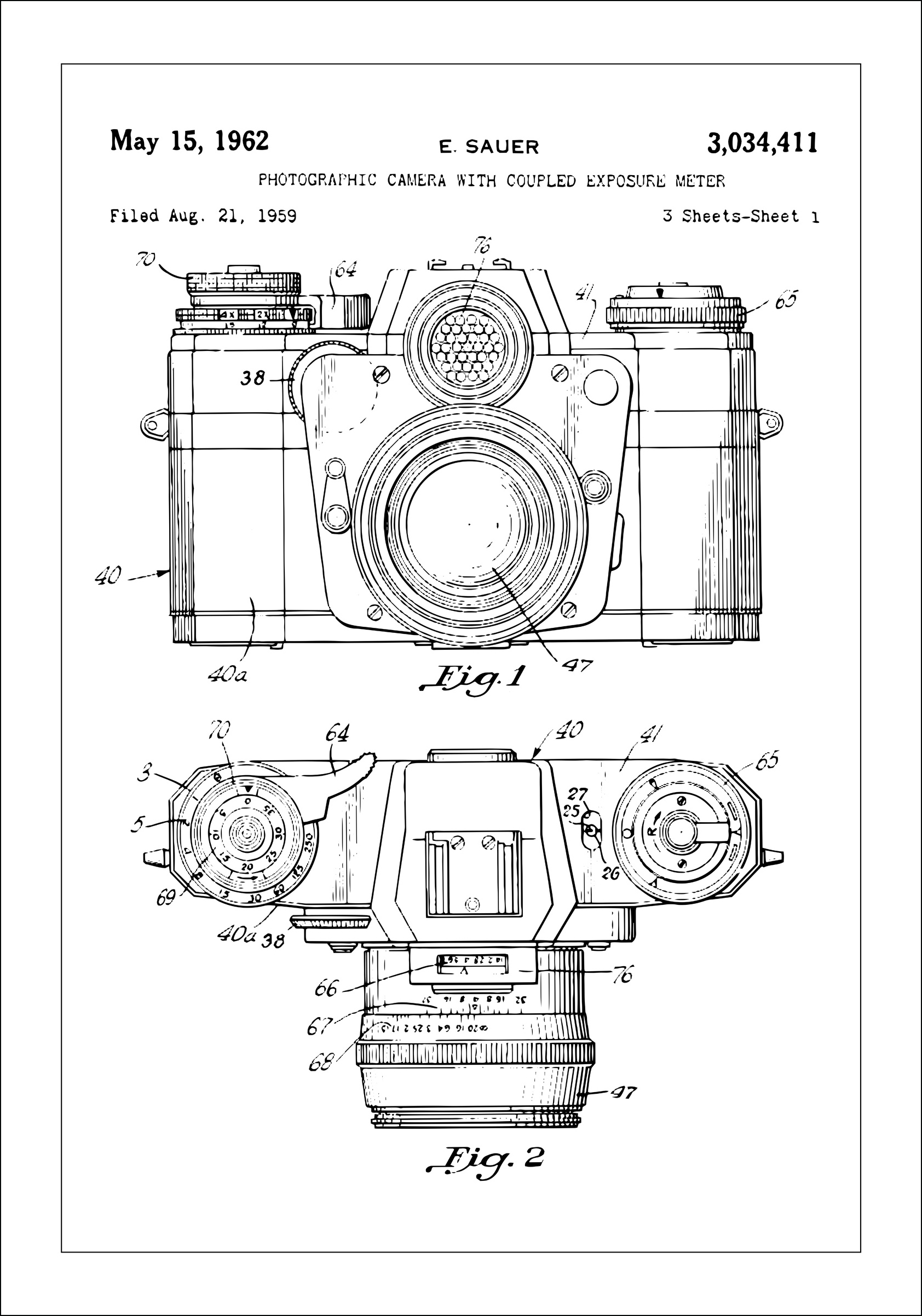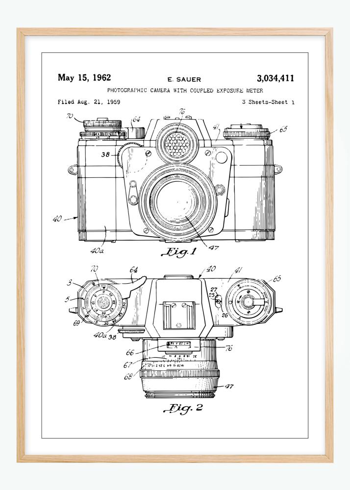 Il brevetto, numerato 3,034,411, è stato registrato il 21 agosto 1959 e rilasciato il 15 maggio 1962 a E. Sauer. Questo poster di brevetto non è solo un omaggio all'età d'oro della fotografia ma anche un simbolo di design e creatività senza tempo. È un pezzo d'arte ricco di idee che si adatta sia a stili di arredamento minimalisti che industriali, un vero avviatore di conversazioni che completa ogni stanza in cui è posizionato.