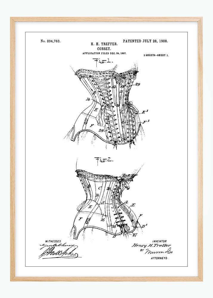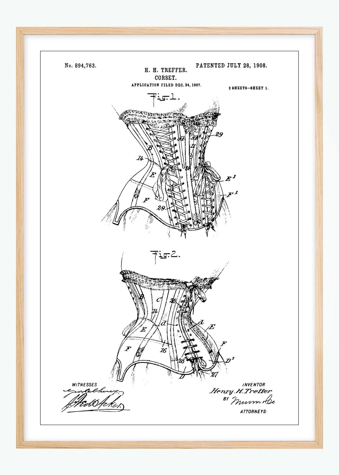 Questa locandina di brevetto raffigura un disegno di un corsetto, un'innovazione nel design di moda brevettata a Henry H. Treffer il 28 luglio 1908, con numero di brevetto 894,763. Le illustrazioni mostrano il design dettagliato del corsetto con la sua allacciatura e struttura, mettendo in risalto la creazione di abbigliamento dell'epoca e il suo focus sulla silhouette e sulla forma.