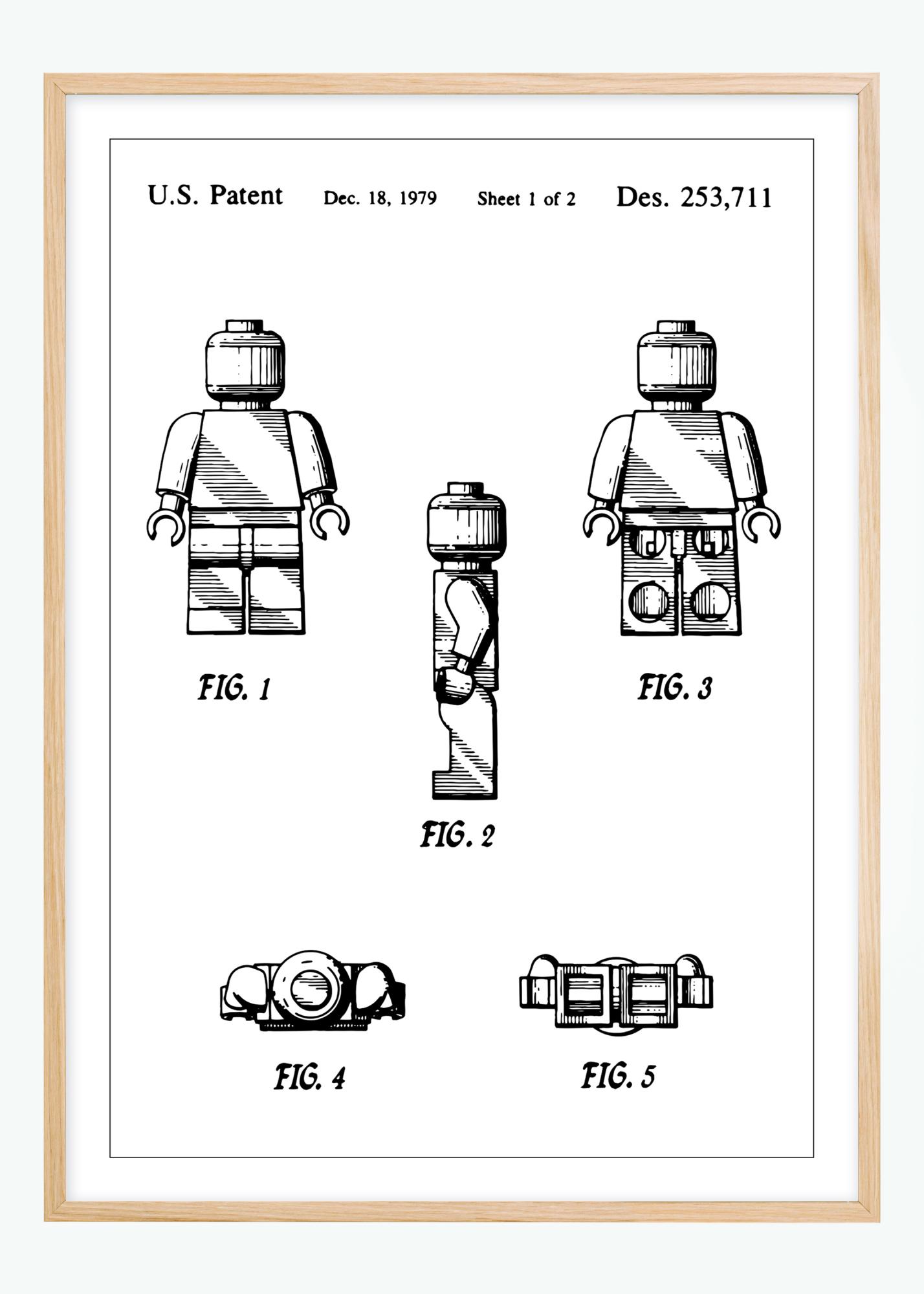 Questo poster rappresenta una classica figura Lego costruibile, che è un giocattolo senza tempo e creativo che ha catturato l'immaginazione dei bambini per generazioni. Concesso il 18 dicembre 1979, con il numero di brevetto Des. 253,711, il disegno raffigura una figura costruibile in diverse viste, dimostrando il design modulare e la flessibilità del giocattolo. È una rappresentazione semplice, ma al contempo geniale, del concetto di gioco educativo e interattivo.