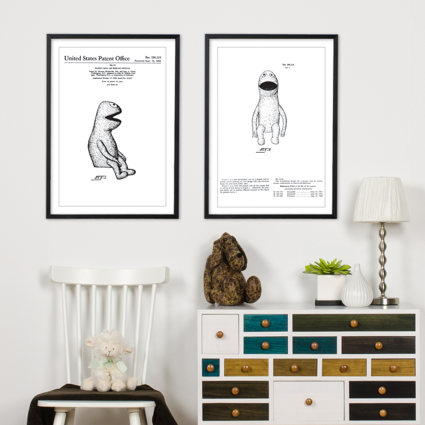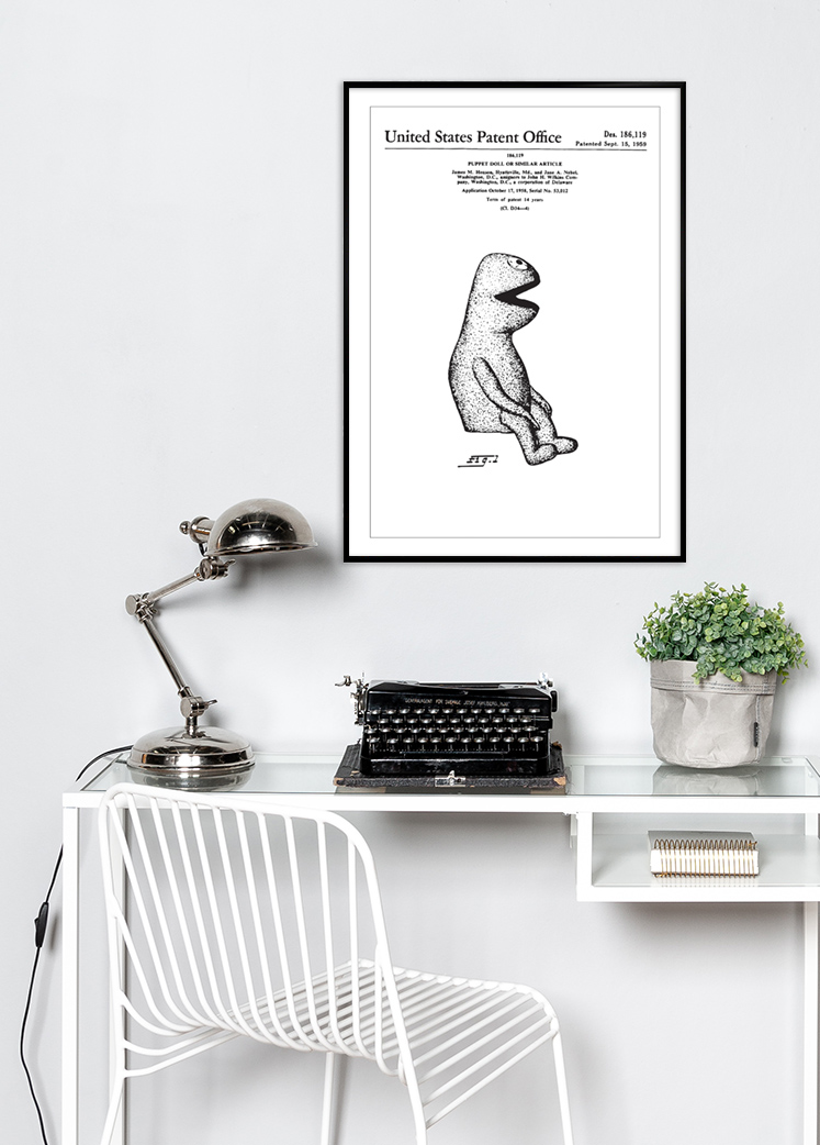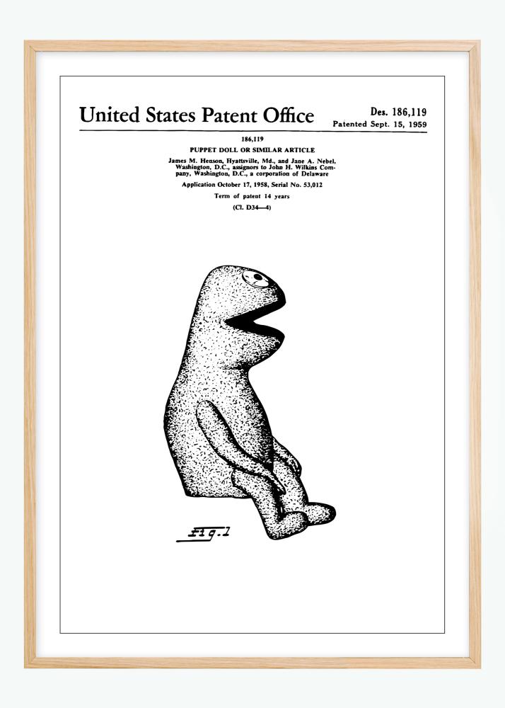 Questo poster di brevetto riproduce il design di Kermit, un'innovazione nell'ambito dei giocattoli che è stata ufficialmente documentata il 15 settembre 1959 sotto il numero di brevetto Des. 186,119. La figura illustrata mostra una vista laterale unica della bambola, che con la sua forma distintiva e carismatica offre uno sguardo nel design dei giocattoli della metà del XX secolo. Questo era un periodo in cui il design e la creatività prendevano sempre più importanza nell'industria dei giocattoli, di cui questa bambola è un esempio.