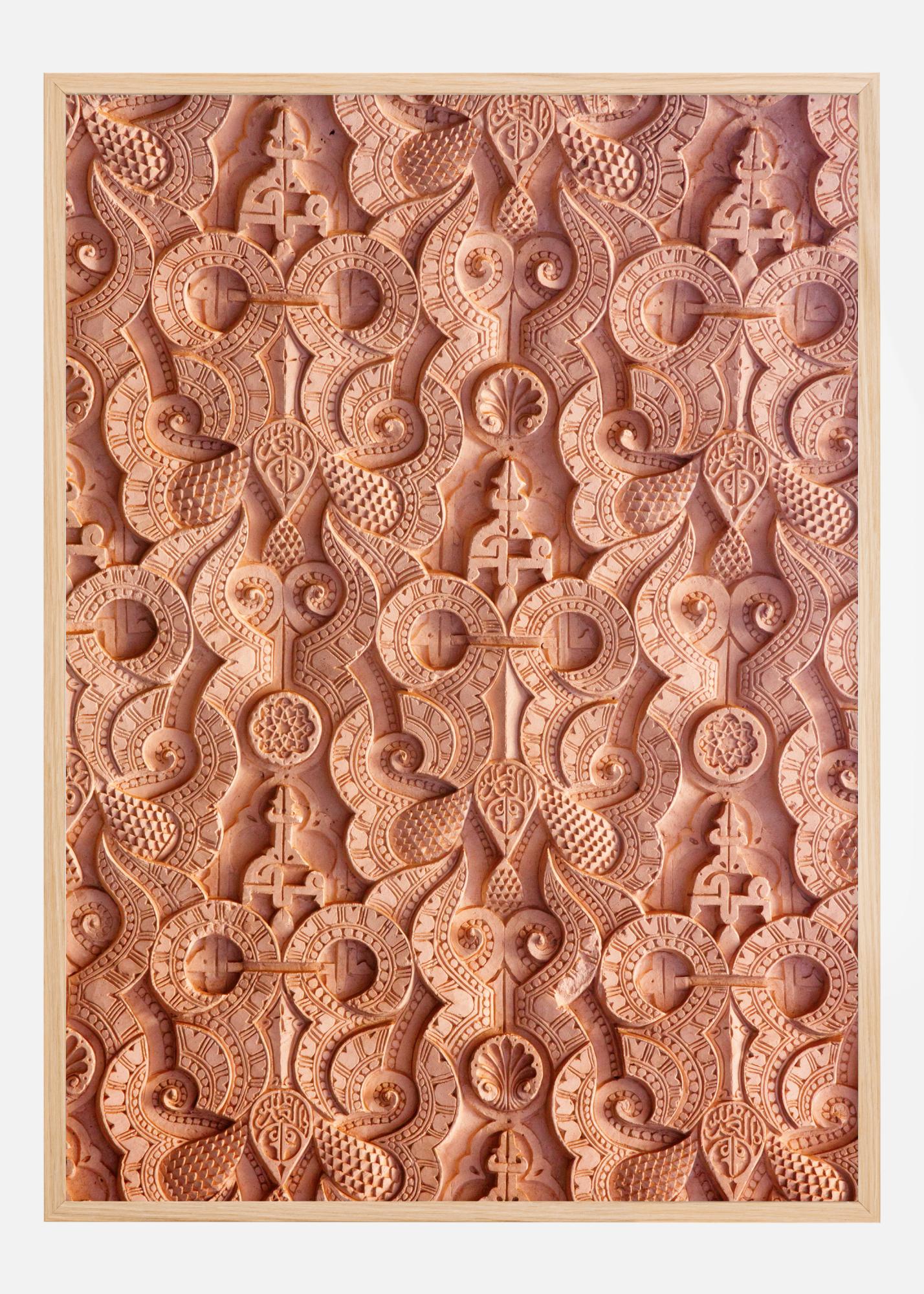 I colori del motivo rimangono all'interno di una palette di terracotta calda e argilla, dando una sensazione naturale e rustica all'immagine. Il motivo dettagliato risalta bene contro lo sfondo uniforme creando un'illusione tridimensionale che è sia attraente che profonda. Questo poster è perfetto per chi apprezza l'arte che cattura l'attenzione e invita a uno studio più ravvicinato, e per chi valorizza l'artigianato e la tradizione nel proprio stile di arredamento.