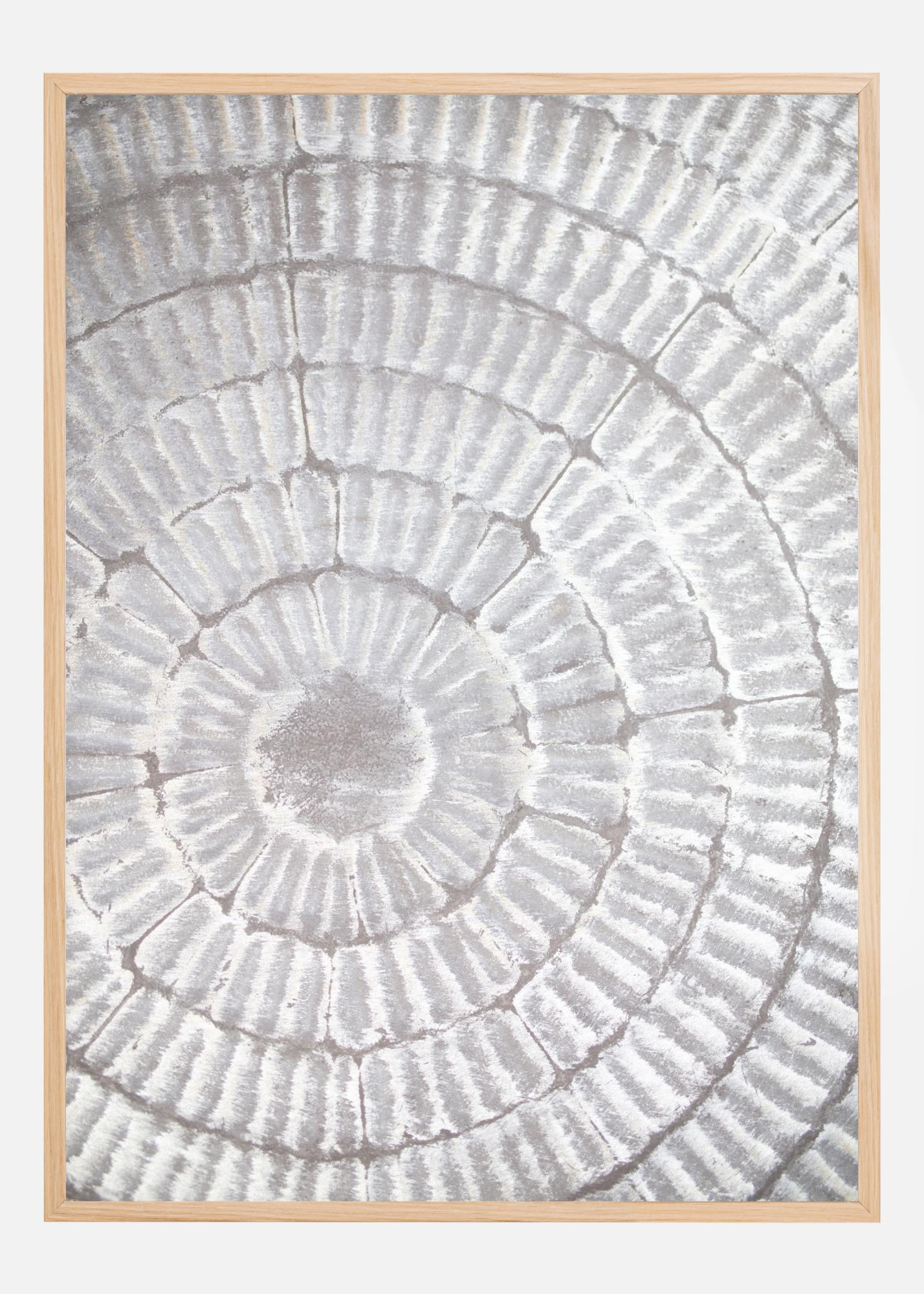 Un poster con un pattern grigio. Gli anelli circolari beige e bianchi creano un aspetto a coste sulla che forma un cerchio perfettamente liscio al centro. Con i suoi colori morbidi e rilassanti, questa splendida immagine crea un'atmosfera tranquilla e misteriosa. Perfetta da appendere su una parete colorata.