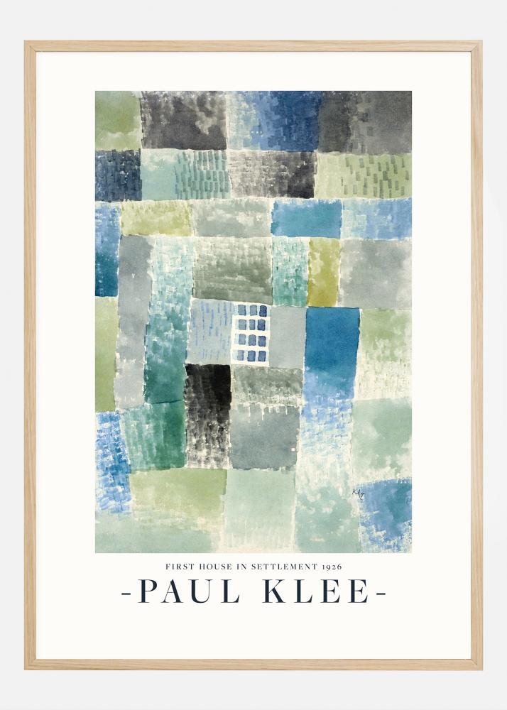 Questo poster vivace di Paul Klee "Prima Casa in un Insediamento" del 1926 è un mosaico di colore e forma che si intrecciano in una affascinante vista cittadina. I quadrati e i rettangoli sfaccettati creano una campagna astratta in toni freddi e caldi di blu, verde e grigio, evocando la sensazione di una piccola città in tranquillità. Klee gioca con la prospettiva, dove alcuni blocchi sembrano essere in primo piano e altri sullo sfondo, permettendo all'occhio di vagare attraverso il paesaggio mutevole dell'opera d'arte.