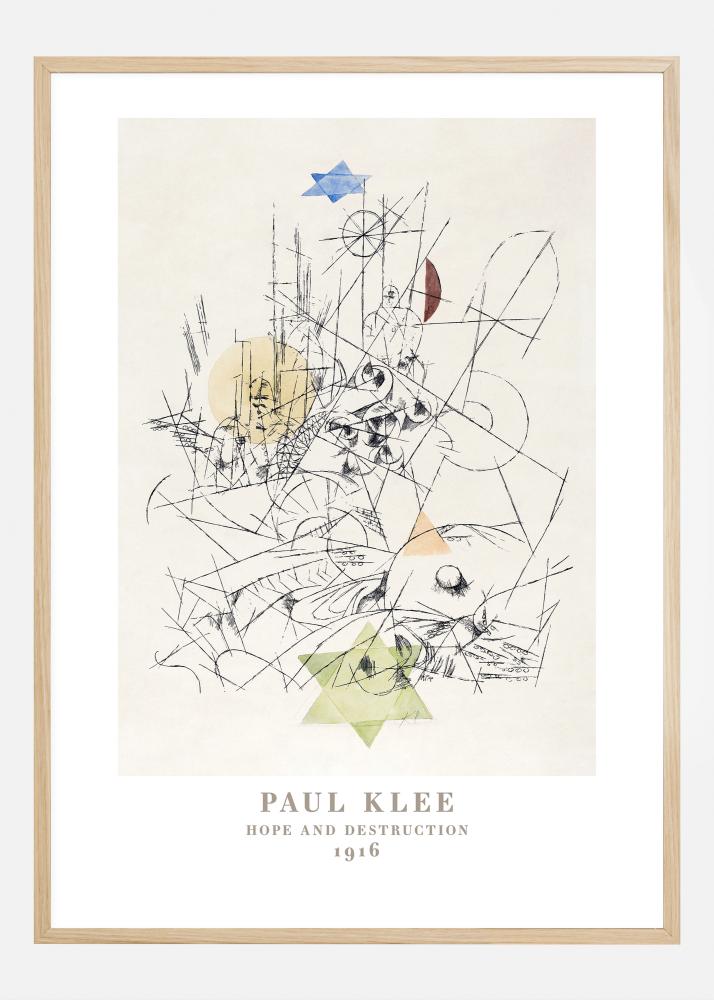Questo poster artistico raffigura un'opera di Paul Klee, intitolata "Speranza e Distruzione" dal 1916, e cattura una combinazione unica di arte astratta e simbolismo che è caratteristica dello stile di Klee. Il motivo è ricco di linee e forme che interagiscono sulla superficie della composizione, conferendo una sensazione sia di ordine che di caos. È una stampa che potrebbe attrarre coloro che apprezzano l'arte sia moderna che contemporanea, ideale per aggiungere una dimensione stimolante a qualsiasi stanza o ufficio.