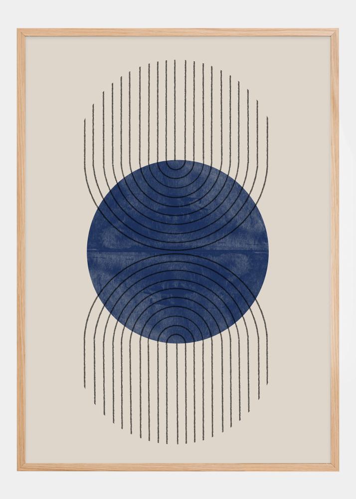 Questo poster minimalista e astratto raffigura una forma circolare di un blu intenso centrata all'interno di una serie di linee verticali che creano un'illusione di movimento e dimensione. L'opera d'arte gioca con l'esperienza ottica di prospettiva e profondità attraverso il motivo ripetitivo, facendo sembrare che il cerchio blu pulsare o vibrare. La sobria gamma di colori consiste in un blu profondo su uno sfondo neutro che mette in risalto le linee pulite e la semplice bellezza del design.