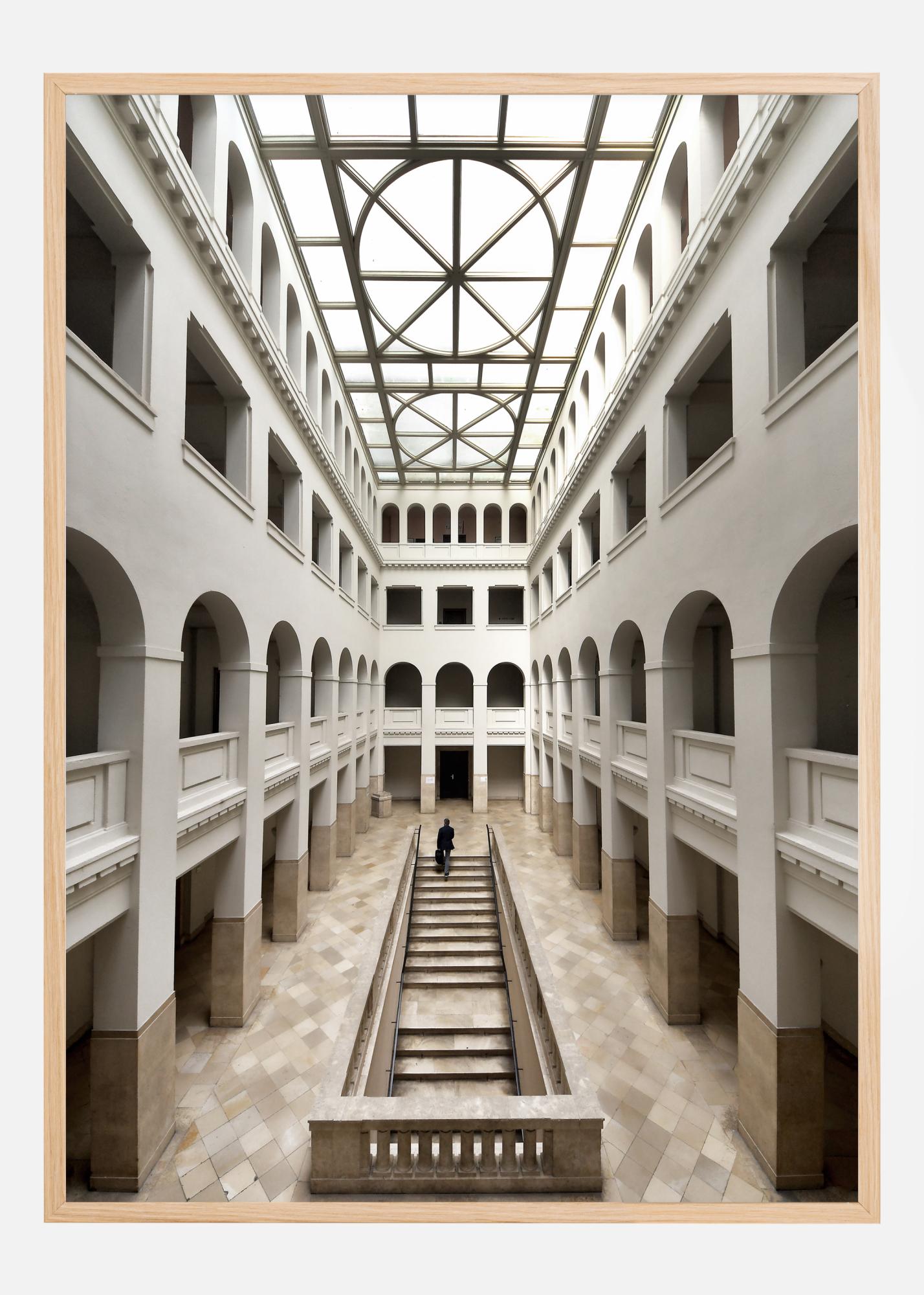 Un magnifico poster con l'edificio di Peter Behrens. L'arredamento beige e bianco cattura una figura che sale le scale. Il tetto trasparente illumina i dettagli dell'architettura con finestre circolari e quadrate che lasciano passare la luce. Crea un'atmosfera elegante con questa fantastica stampa.