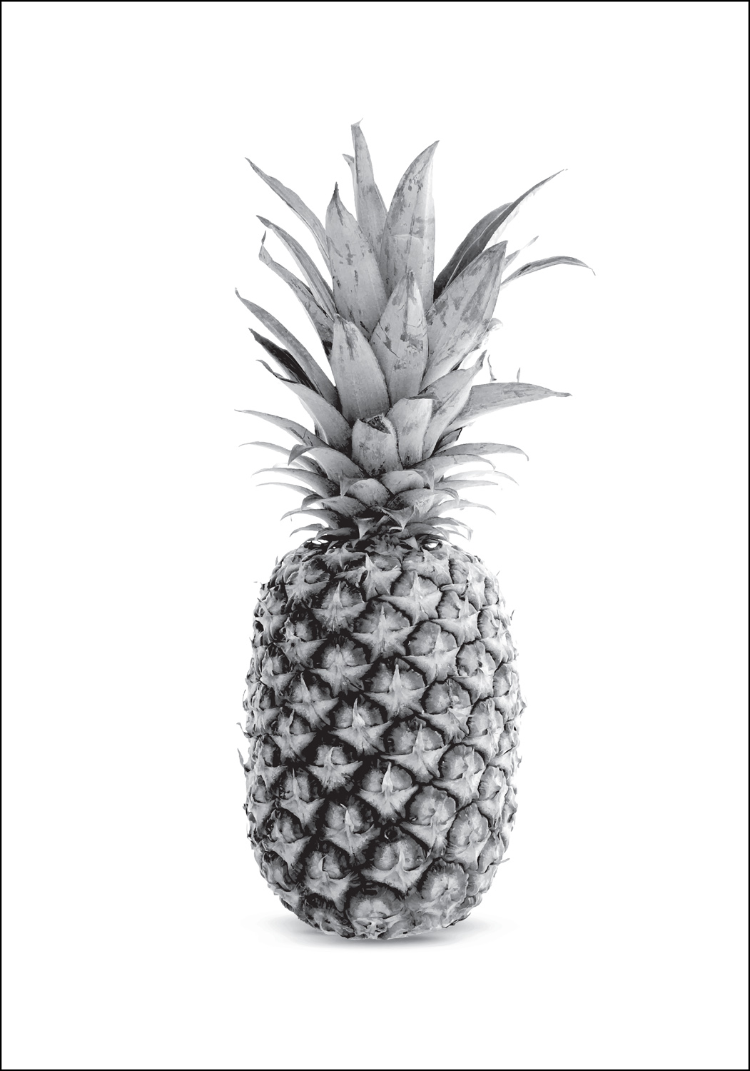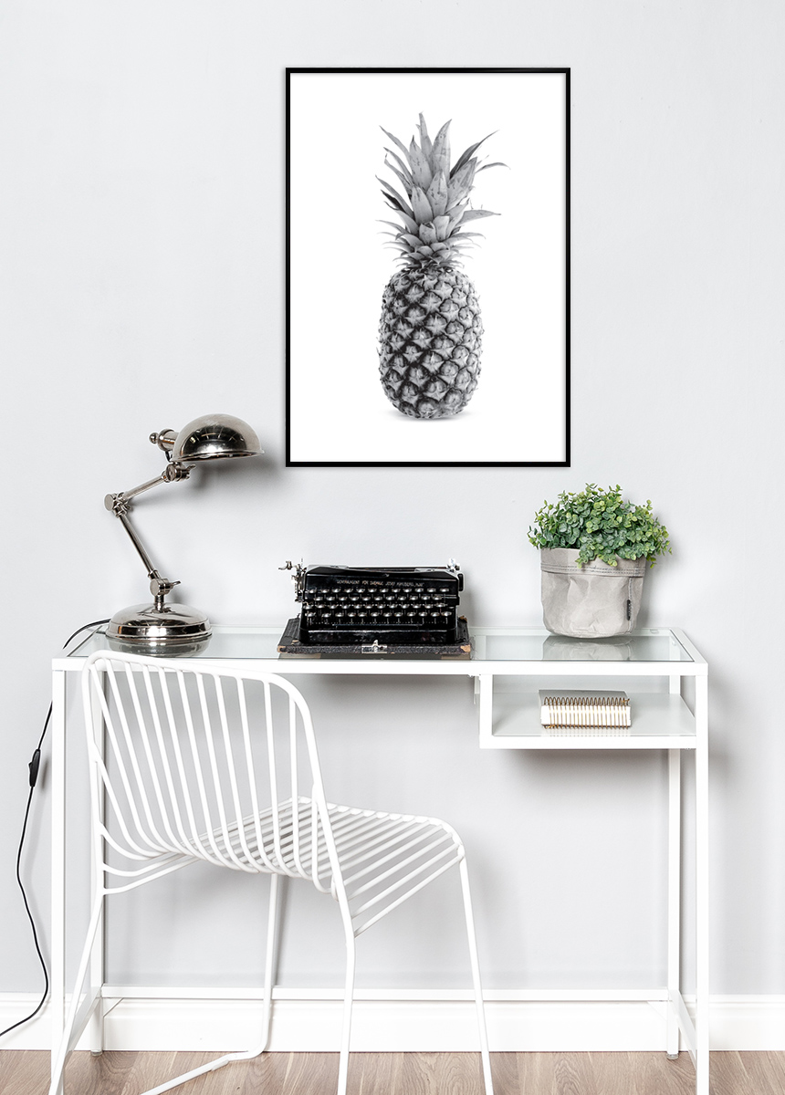 Poster con il frutto preferito degli appassionati di arredamento e design, l'ananas. Il motivo in bianco e nero fa sì che il poster si adatti a tutti gli stili di arredamento e alle stanze di casa, la stampa si adatta bene anche a un ambiente pubblico. Completare con una cornice di colore uniforme e sottile che non competa con il motivo e che si adatti all'ambiente in cui il quadro verrà appeso.