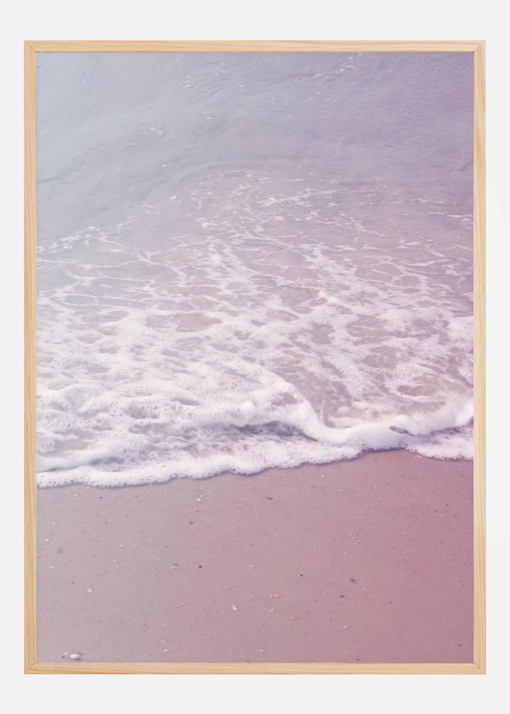 Un fantastico ritratto della spiaggia marina. Quando le onde si infrangono sulla spiaggia, si forma una schiuma bianca sulla sabbia. La bellissima sabbia rosa e il mare creano un'atmosfera estiva. Porta l'estate nella tua casa con questo poster rinfrescante.