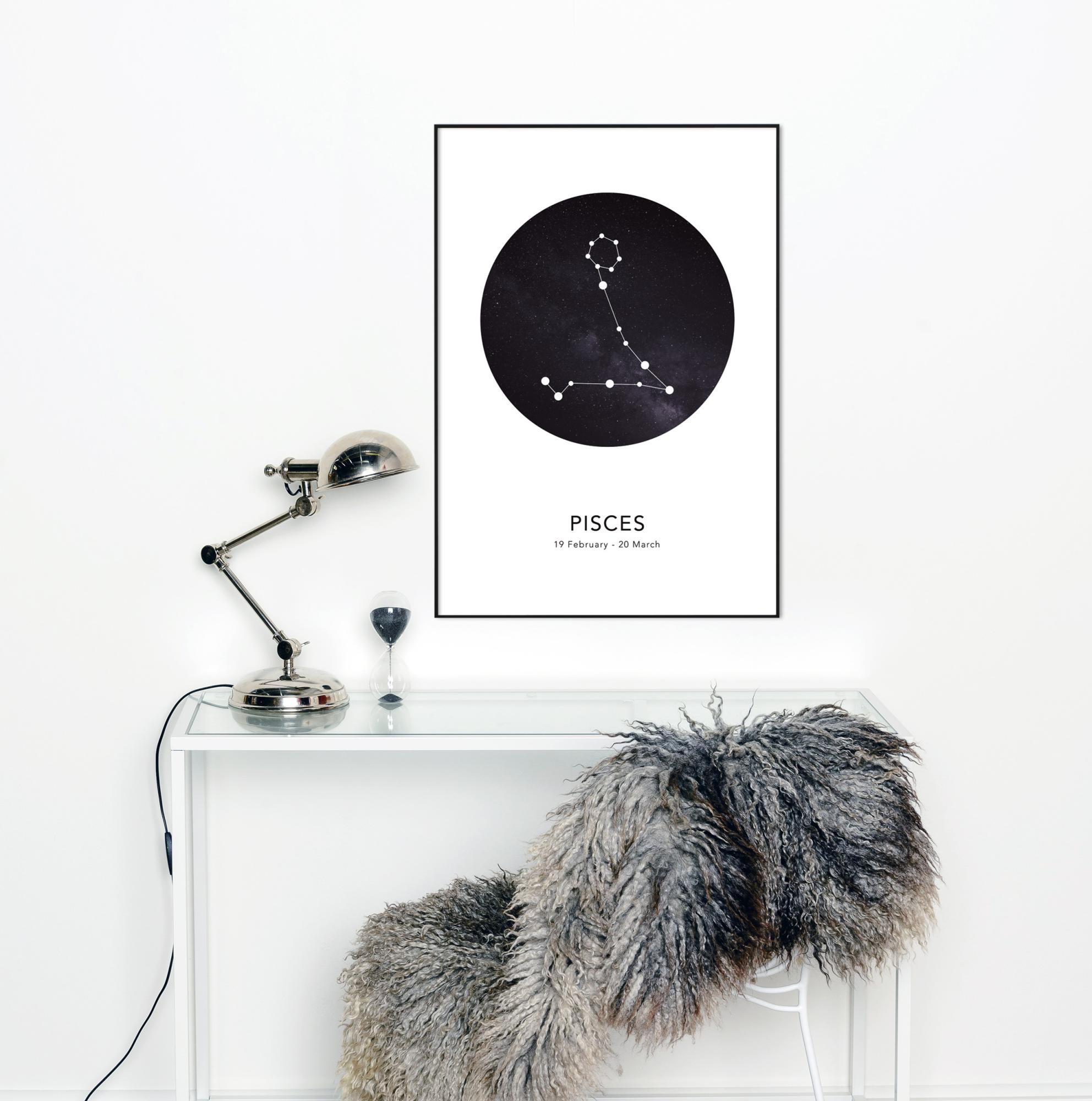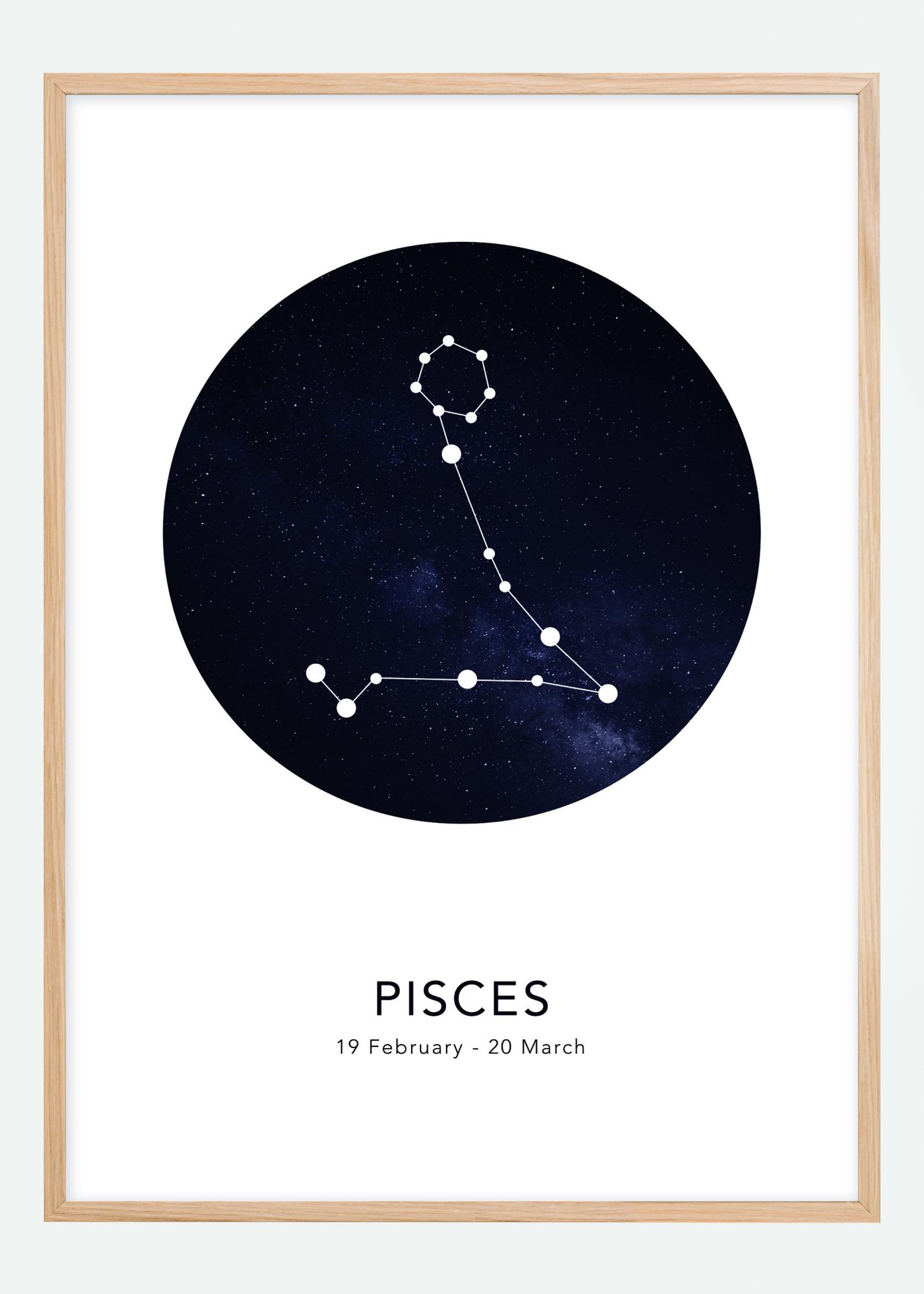 Regala un poster personalizzato a qualcuno che ami! Questo elegante poster ha un motivo del segno zodiacale dei Pesci su uno sfondo di cielo stellato nero e blu. Sotto c'è il nome insieme alla data corrente in inglese.
