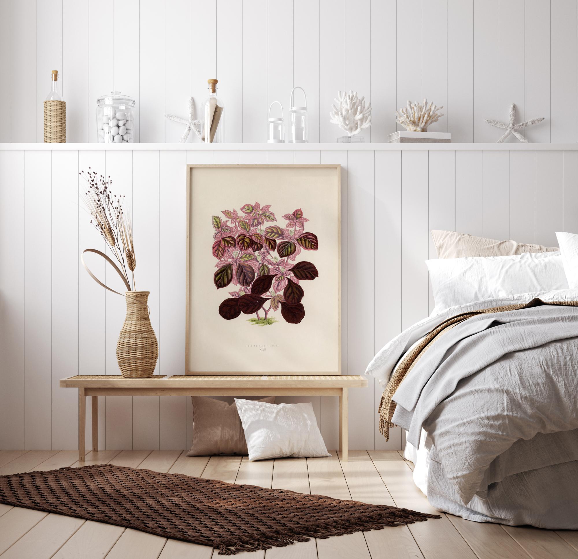 Una bellissima stampa a mano di due Plectranthus scutellarioides rosa. Lo sfondo beige morbido mette in risalto le bellissime sfumature di rosa e verde. Verso il gambo della pianta, il colore rosso vinaccia crea una sensazione calda nel poster. Appendi questa stampa nella tua collezione d'arte a casa.