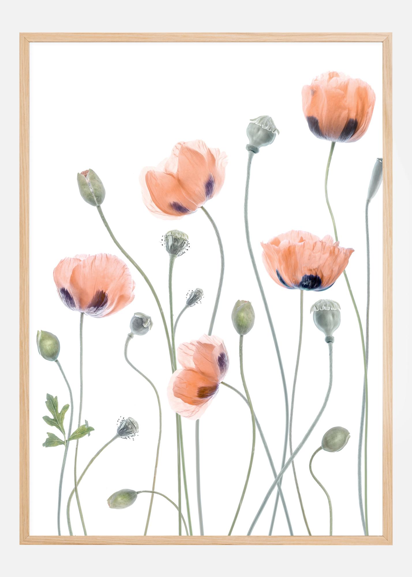 Una deliziosa stampa di papaveri intrecciati con erba secca. Su uno sfondo bianco, i fiori di papavero color pesca si fondono perfettamente con l'erba verde chiaro. Ogni papavero ha un'altezza diversa. Un poster bello e rilassante da appendere in una cucina rustica.