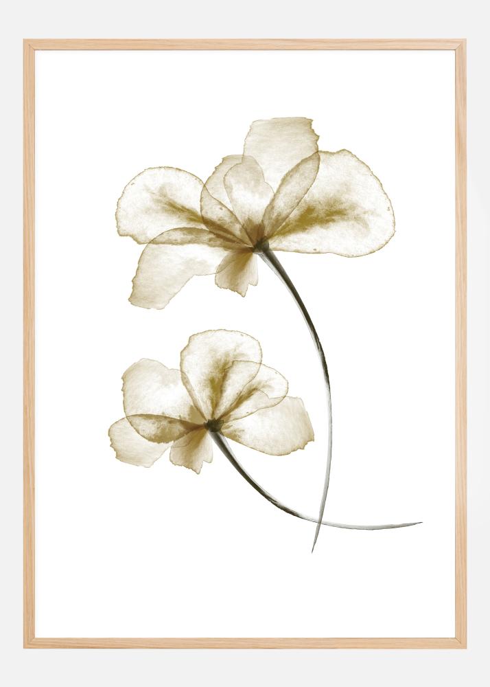 Un poster semplice ma elegante con due fiori bianchi su uno sfondo bianco. In basso sulla stampa, i fiori si sovrappongono delicatamente, conferendo alla stampa un tocco delicato. La trasparenza delle tonalità marroni e beige morbide sarebbe perfetta su una parete color crema.