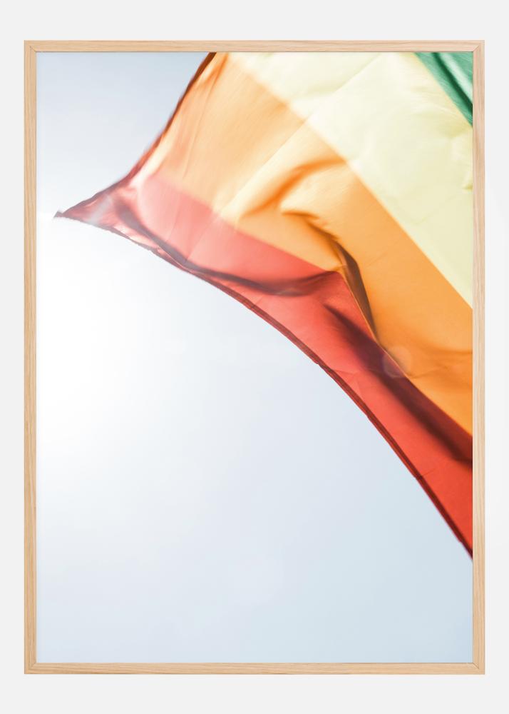 Una stampa simbolica di una bandiera su uno sfondo grigio. Posizionata nella metà superiore della stampa, la bandiera sventola delicatamente al vento. Le strisce rosse, arancioni, gialle e verdi sono disposte orizzontalmente sulla bandiera. Un poster colorato che illumina qualsiasi parete di un bar.