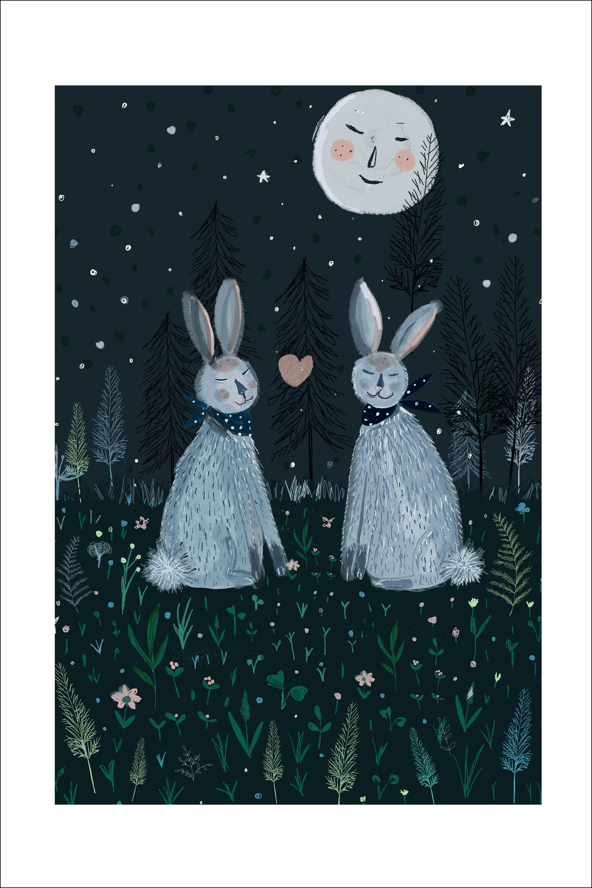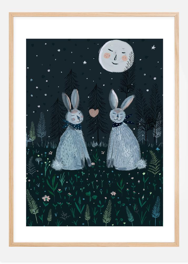 Un poster divertente con la luna e conigli selvatici che dormono tranquilli. Le stelle brillano mentre le piante del terreno si trovano intorno nell'atmosfera fresca della sera. Con sciarpe annodate intorno al collo dei conigli e un cuore posizionato tra di loro, questa è una stampa perfetta per tutti coloro che sono innamorati.